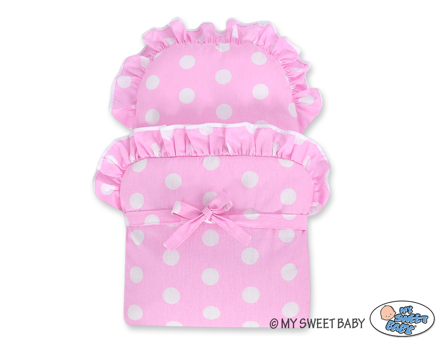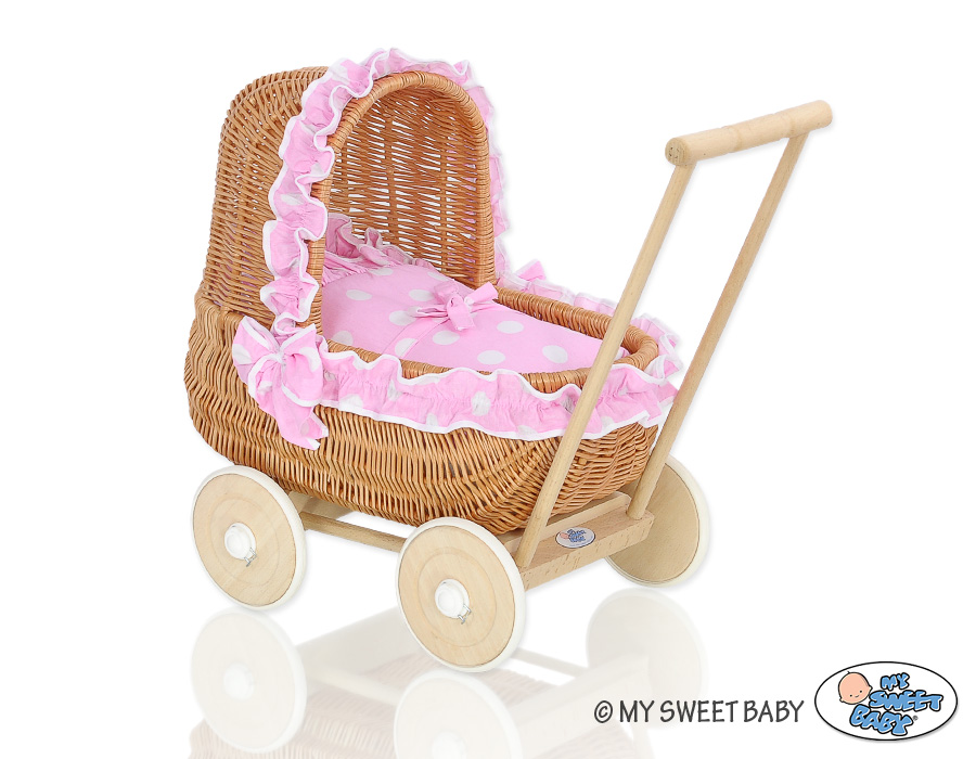 Baby Shop » Baby Toys » Doll prams » Wicker Doll prams » Natural Wicker Dolls Prams » Handmade Stroller Doll Pram made of Natural Wicker and Wood Pink with Big White Dots Bedding Set