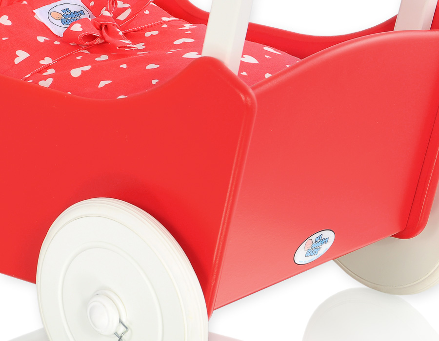 The wheels have non-slip tires that do not scratch the floor. The doll pram has an adjustable wooden handle. It can be mounted on two heights (53cm or 55cm measured from the floor).