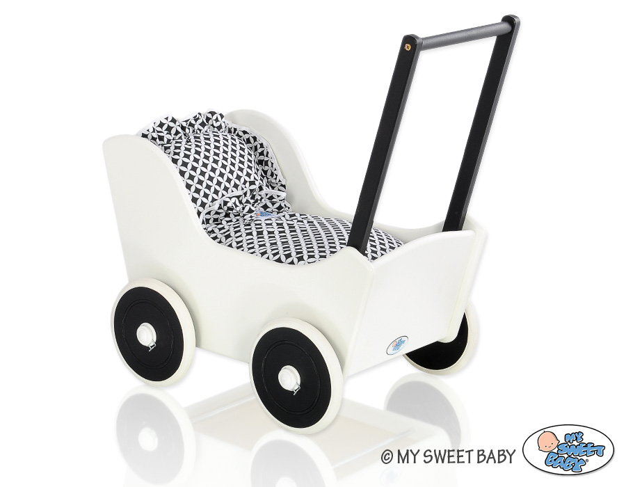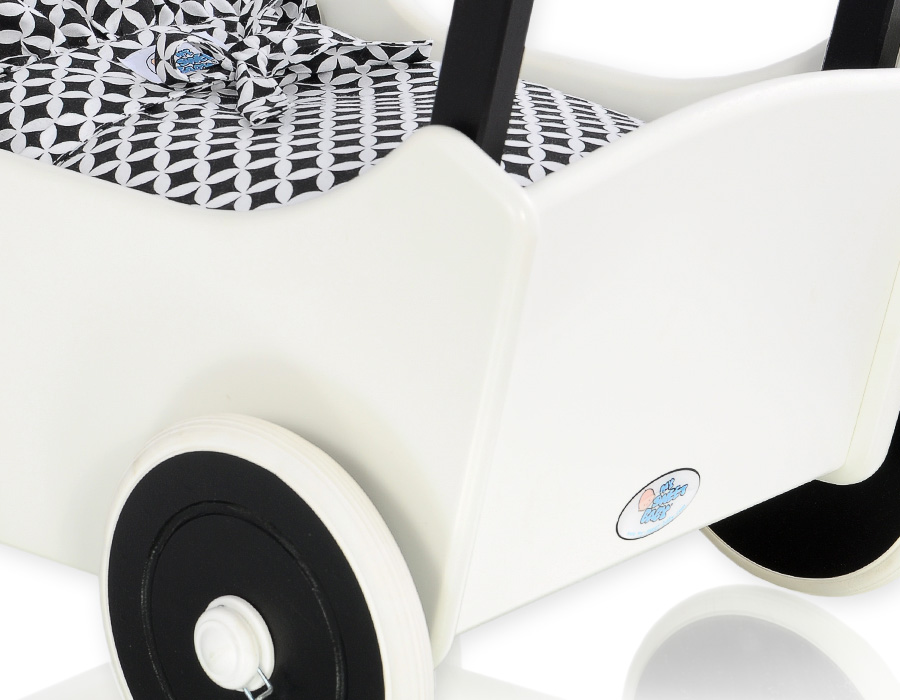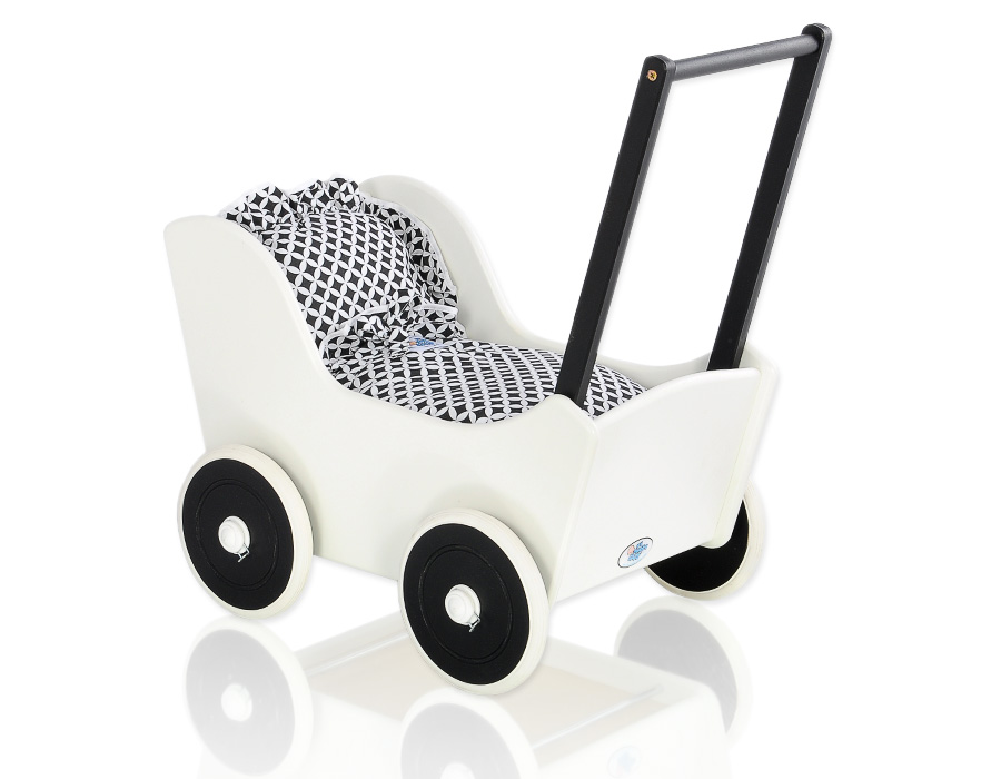 The wheels have non-slip tires that do not scratch the floor. The doll pram has an adjustable wooden handle. It can be mounted on two heights (53cm or 55cm measured from the floor).