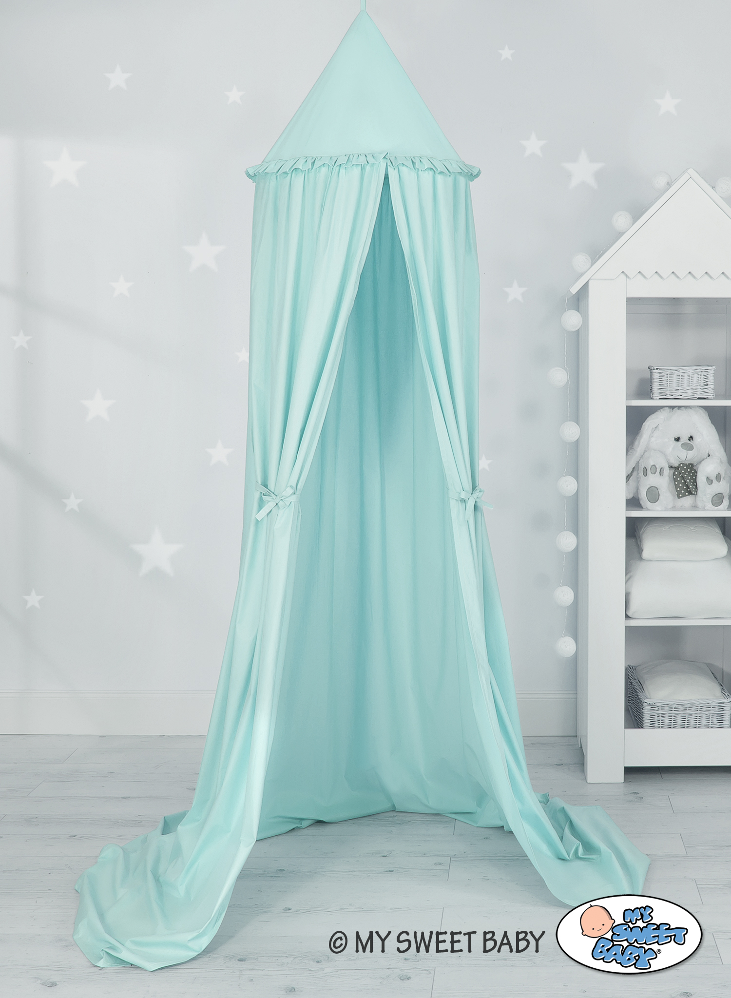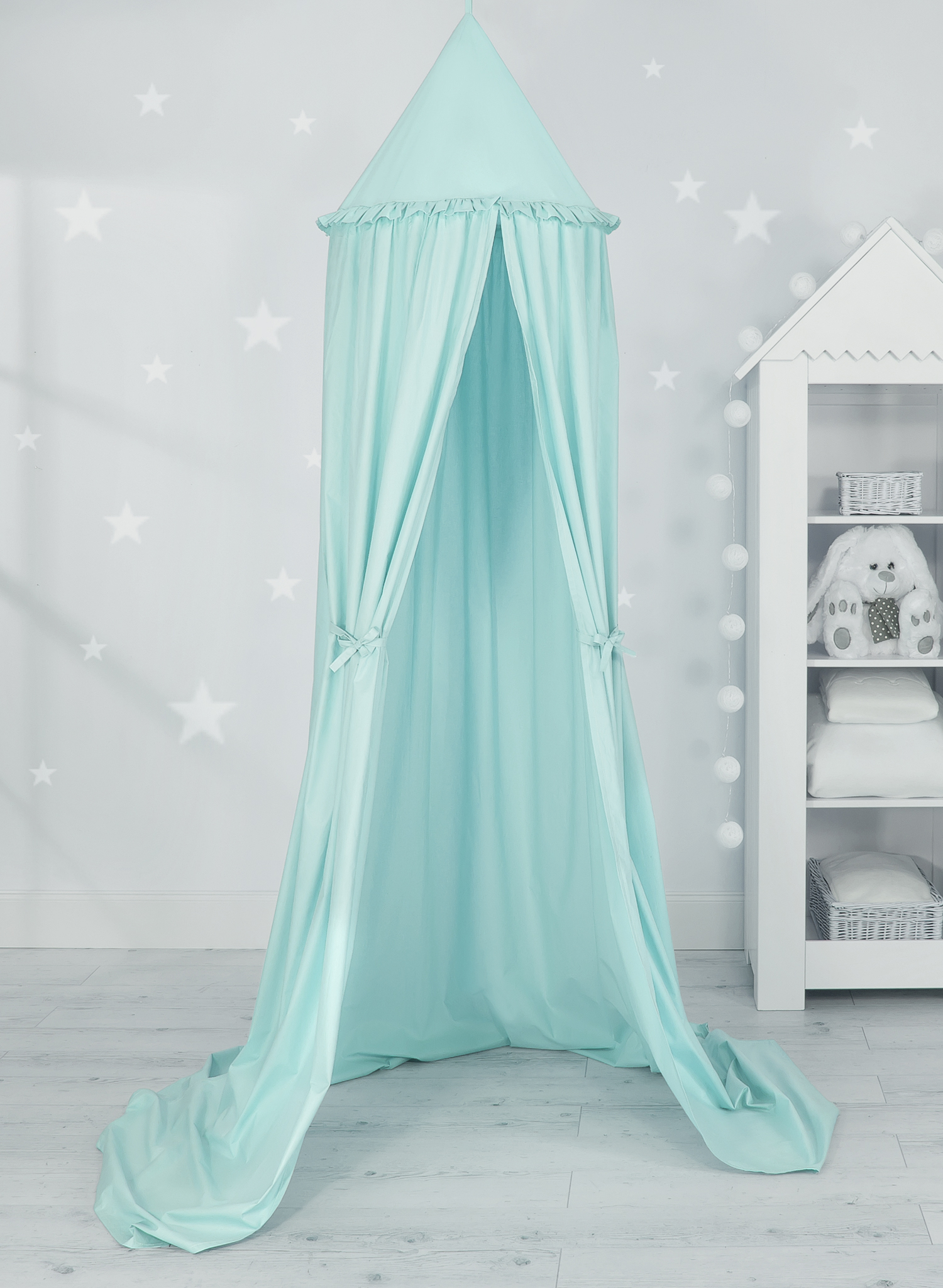 An effective long hanging canopy. A beautiful element it the children's room. It can be used as a unique decoration of a baby cot, as well as it can create a wonderful place to play. Hanging over the cot protect the canopy against too much light and noise creating a cozy and safe place to rest inside the cot. The canopy can be easily mounted to the ceiling. The length of 260 cm allows to arrange the ends on the floor. This creates a perfect hiding place and playground for older children. The canopy is made of Okotex certificated, 100% cotton fabric. On the sides there are practical ribbons for tying the canopy and create a beautiful tent. The rim on the top can be removed. The fabric is washable by 30 Degrees.