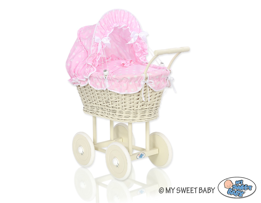 Baby Shop » Baby Toys » Doll prams » Wicker Doll prams » Cream Wicker Dolls Prams » Ivory Wicker Doll Pram Stroller Retro Style Bedding Set White Dots on Pink