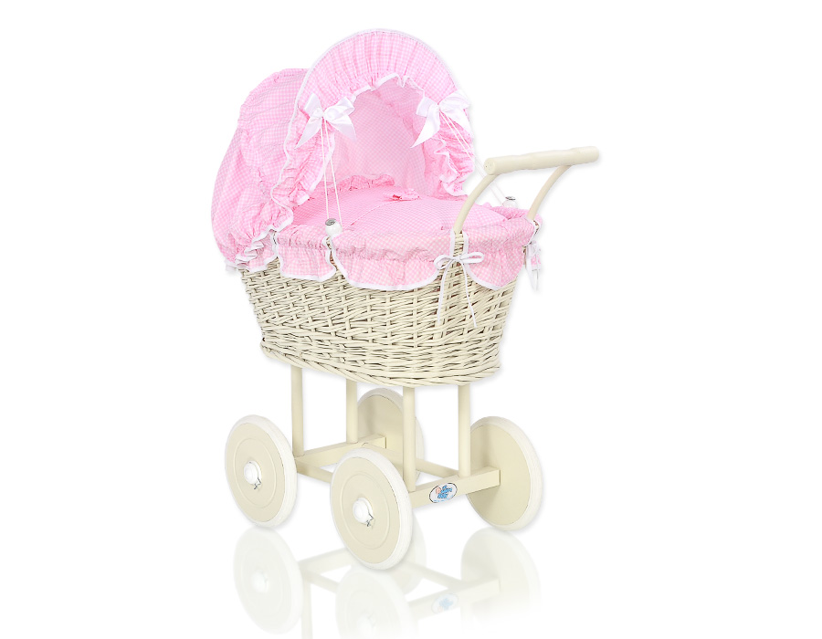 Baby Shop » Baby Toys » Doll prams » Wicker Doll prams » Cream Wicker Dolls Prams » Ivory Wicker Doll Pram Stroller Retro Style Pink checkered Bedding