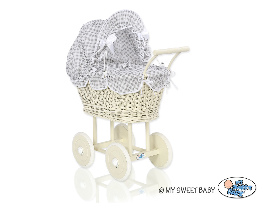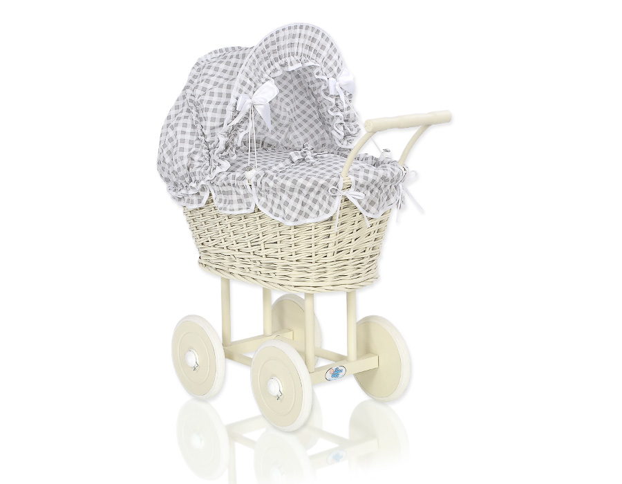 Baby Shop » Baby Toys » Doll prams » Wicker Doll prams » Cream Wicker Dolls Prams » Ivory Wicker Doll Pram Stroller Retro Style White Gray Checkered