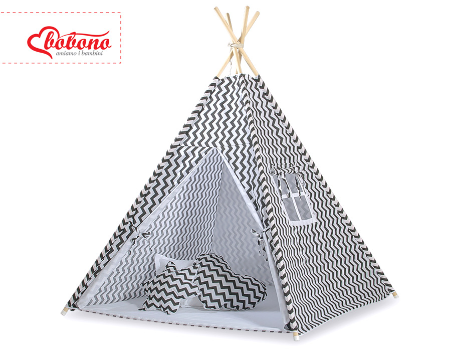 Kids Teepee Tent + decorative feathers- Chevron black This Teepee is a funtastic childrens play tent - great for imaginative play with friends. To share with friends or to just chill in with some books! Brilliant for a child's bedroom, playroom and can be used outside in the garden.