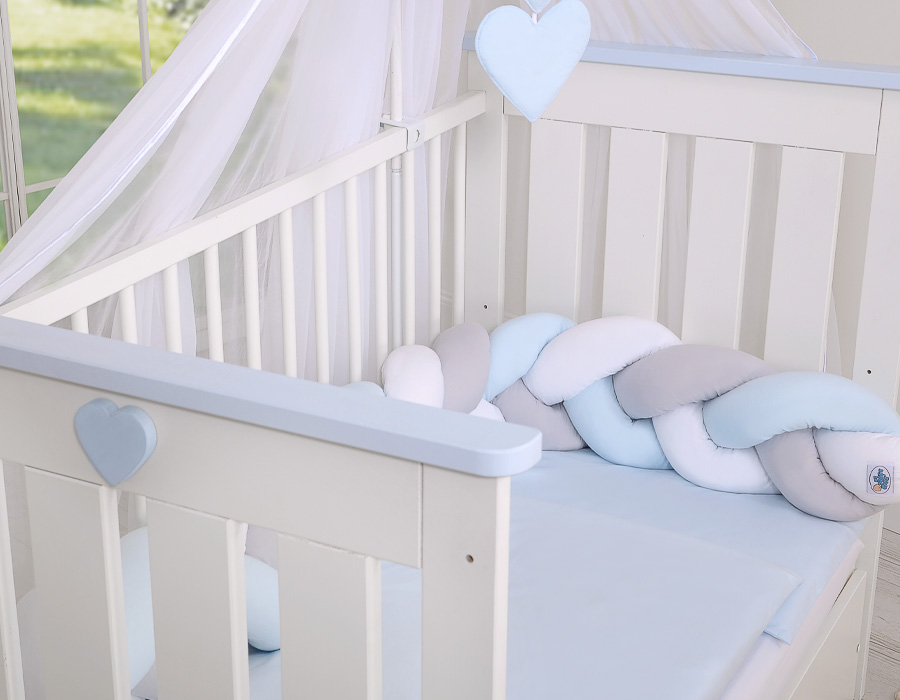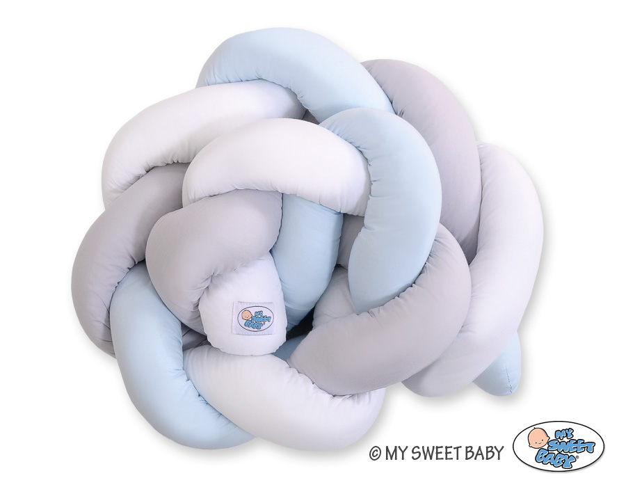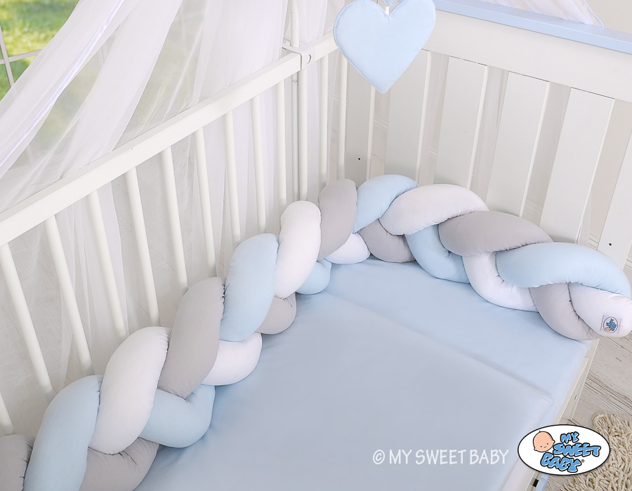 Knotted cot bumper- white-gray-blue Beautiful, very soft braided cot bumper made from 100% cotton. Can be fixed to the bars.