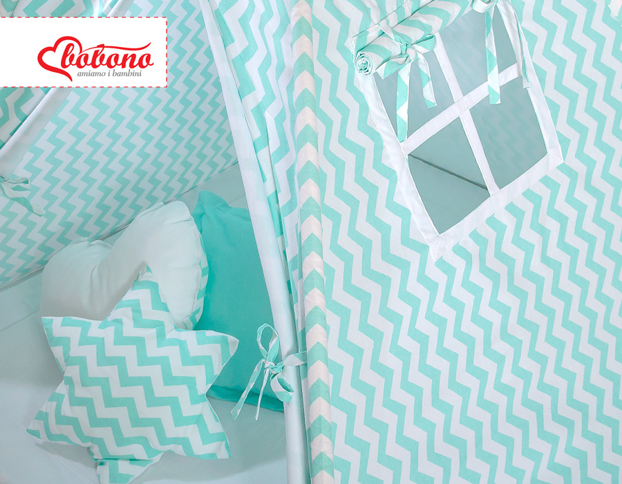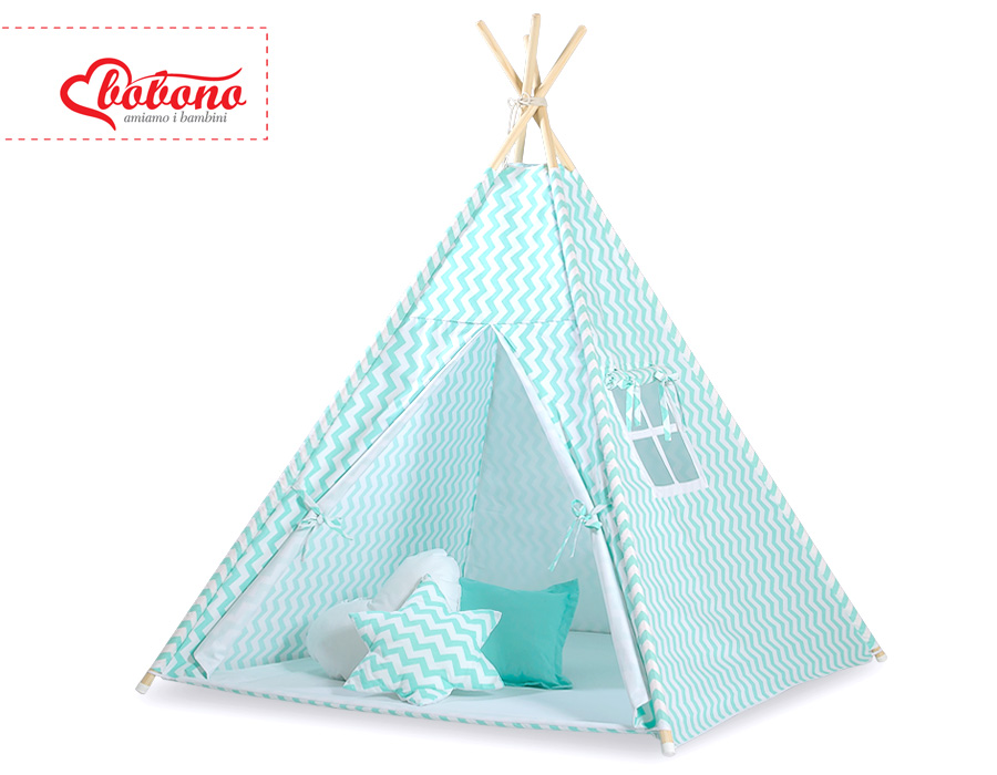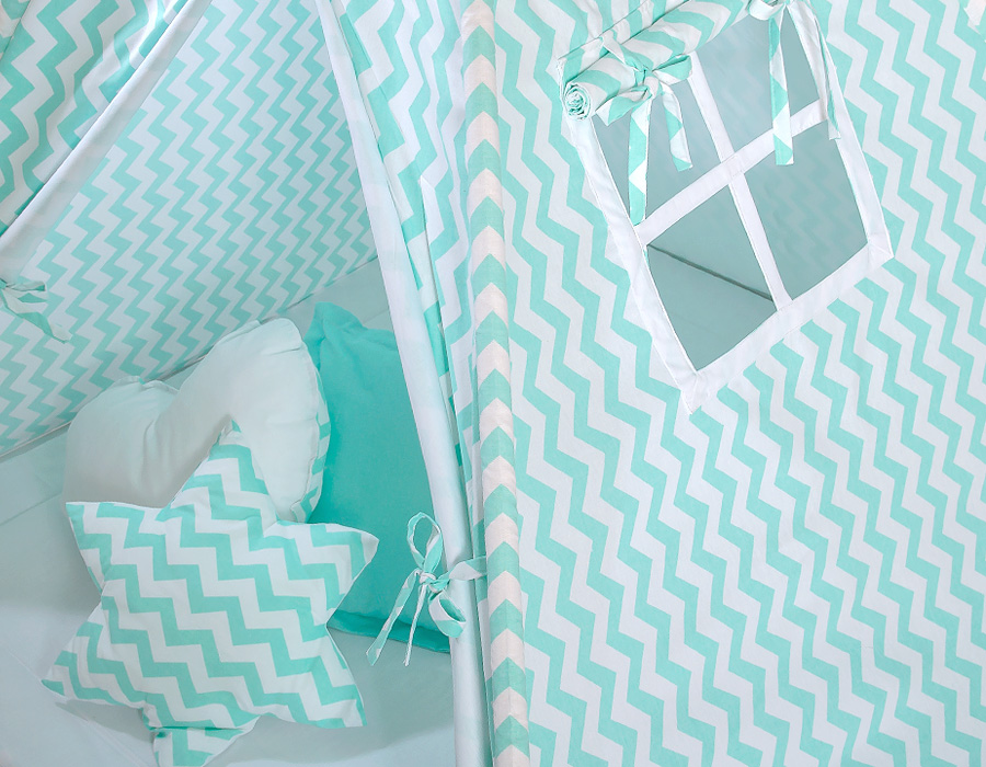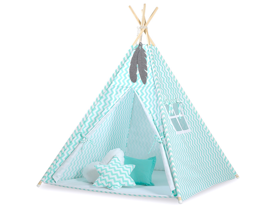 MEGA SET: Kids Teepee tent + playmat + pillows + decorative feathers FREE!- Chevron mint This Teepee is a funtastic childrens play tent - great for imaginative play with friends. To share with friends or to just chill in with some books! Brilliant for a child's bedroom, playroom and can be used outside in the garden.