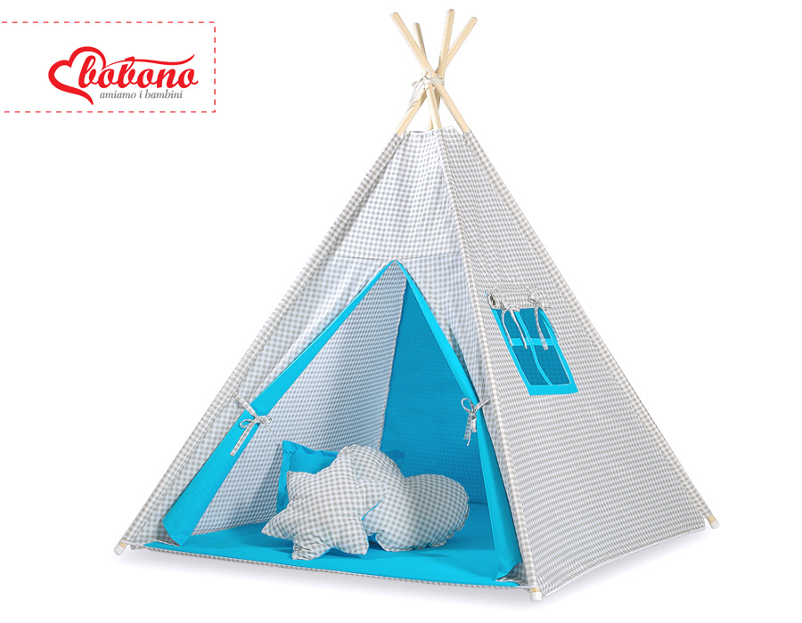 MEGA SET: Kids Teepee tent + playmat + pillows + decorative feathers FREE!- Gray checkered-turquoise This Teepee is a funtastic childrens play tent - great for imaginative play with friends. To share with friends or to just chill in with some books! Brilliant for a child's bedroom, playroom and can be used outside in the garden.