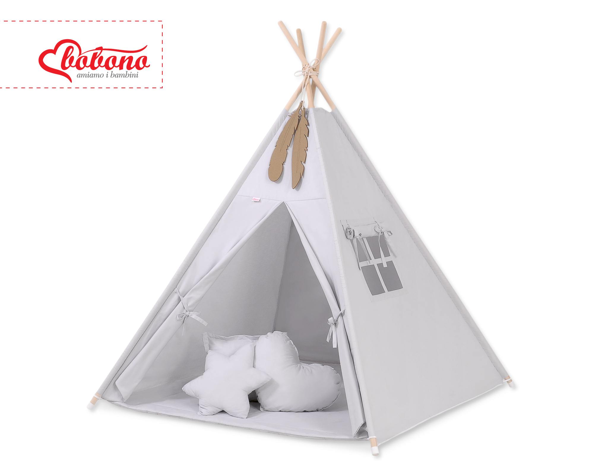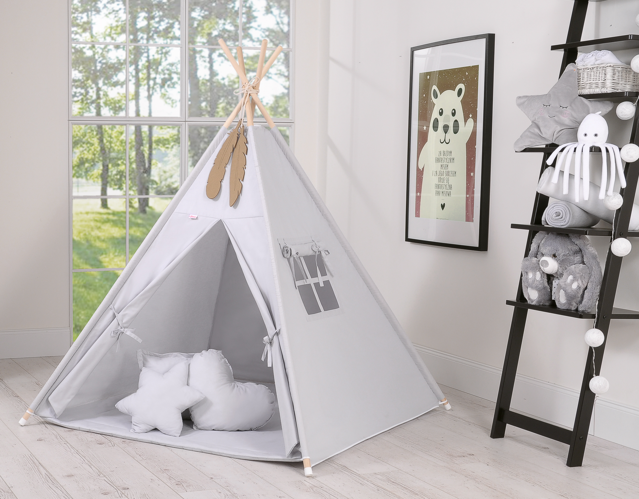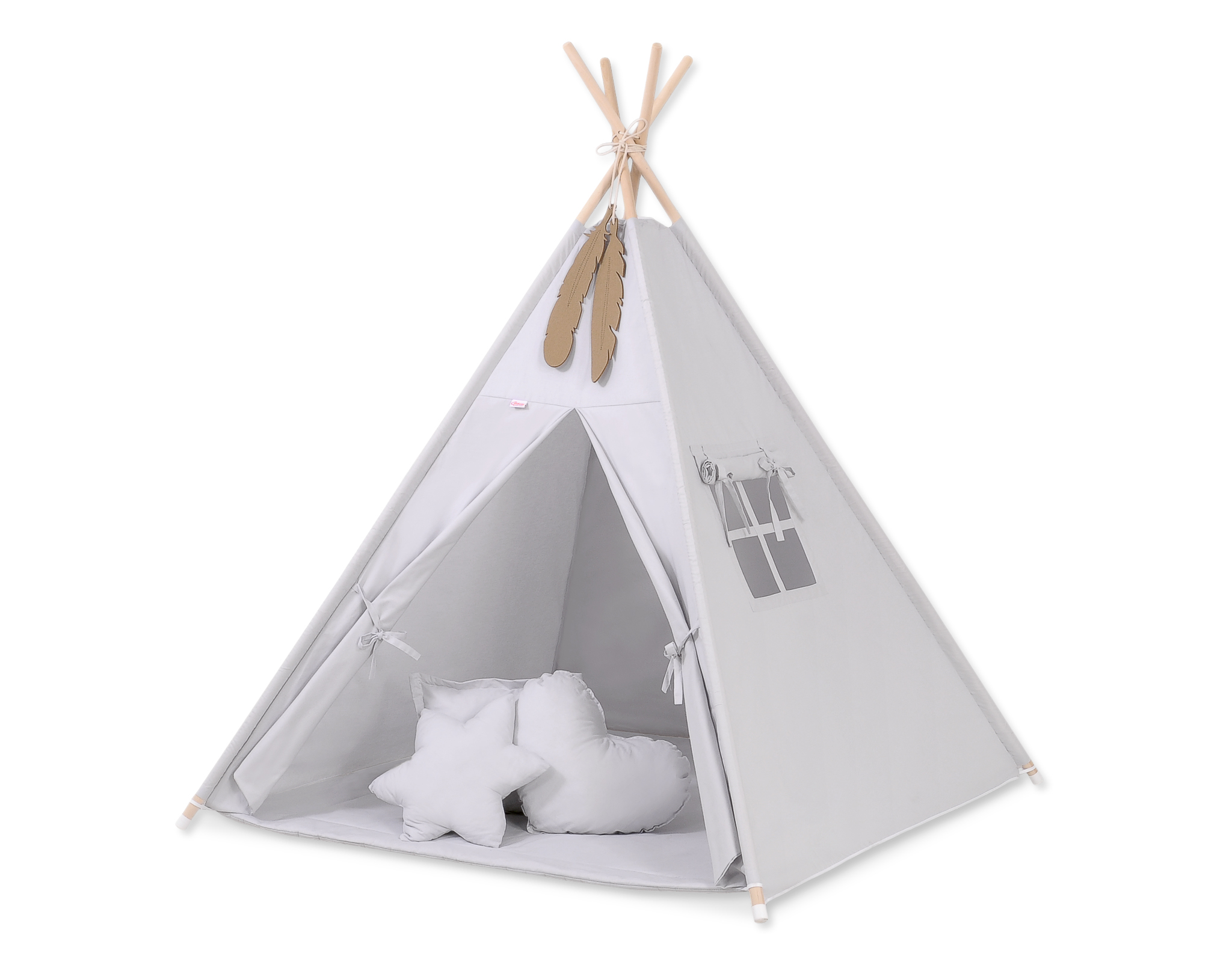 MEGA SET: Kids Teepee tent + playmat + pillows + decorative feathers FREE! - gray This Teepee is a funtastic childrens play tent - great for imaginative play with friends. To share with friends or to just chill in with some books! Brilliant for a child's bedroom, playroom and can be used outside in the garden.