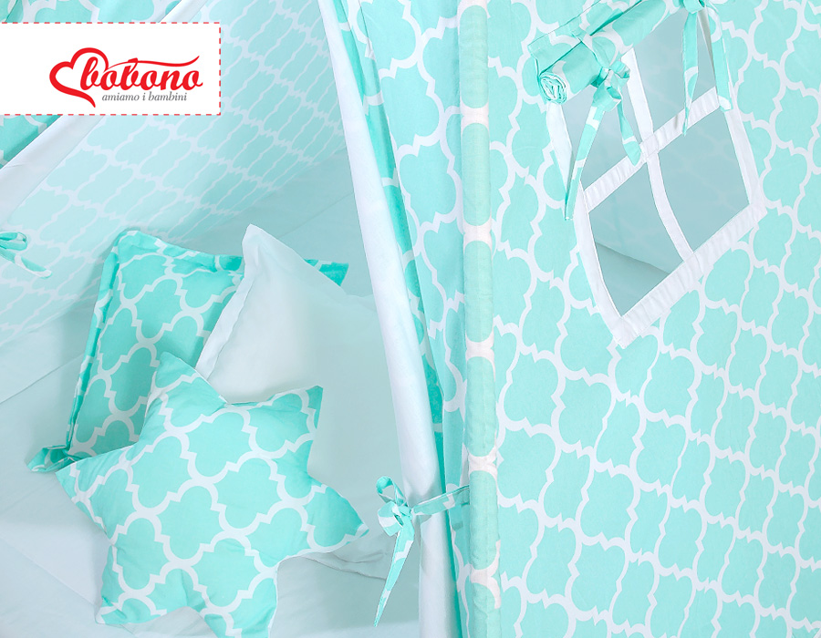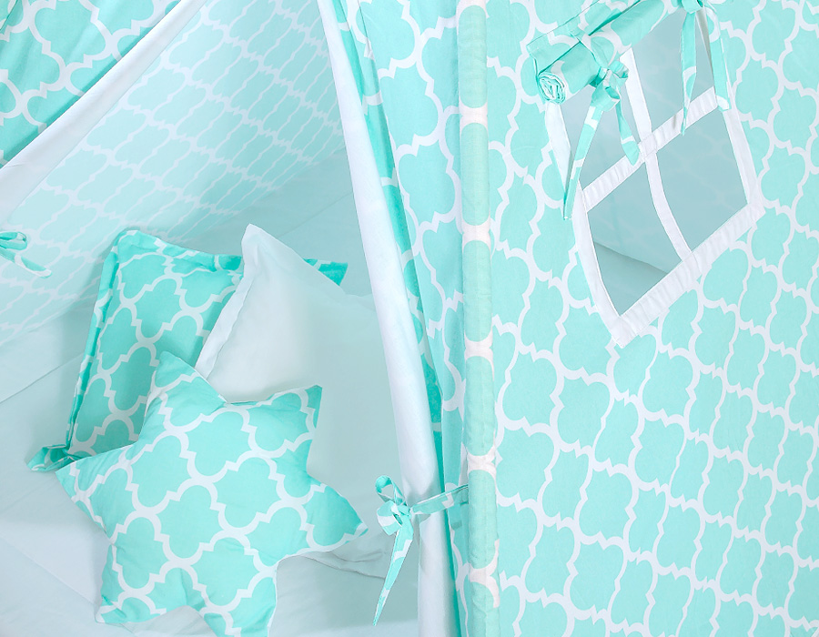 MEGA SET: Kids Teepee tent + playmat + pillows + decorative feathers FREE!- Marocco mint This Teepee is a funtastic childrens play tent - great for imaginative play with friends. To share with friends or to just chill in with some books! Brilliant for a child's bedroom, playroom and can be used outside in the garden.