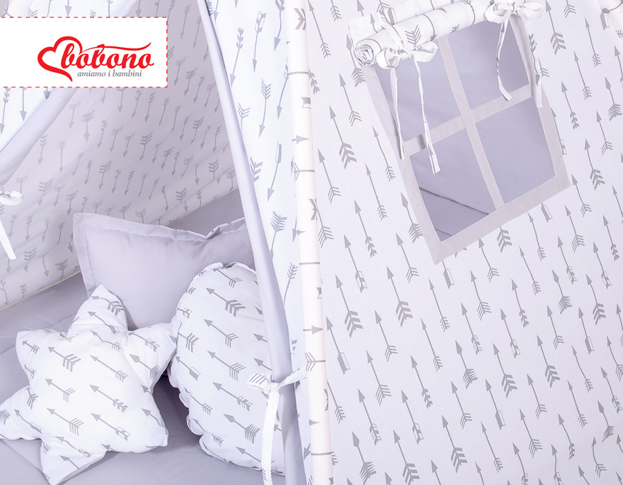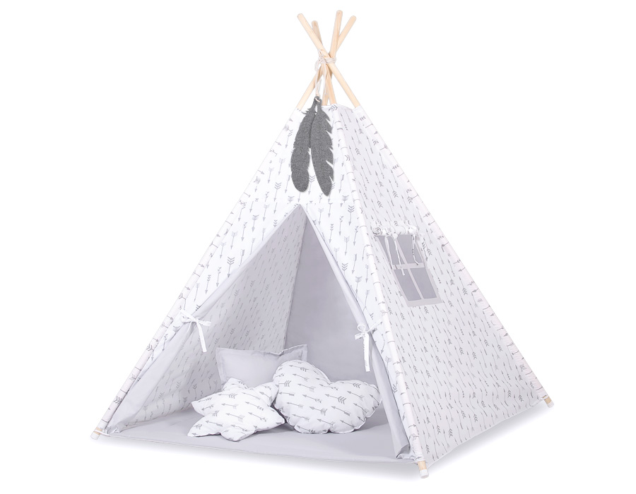 MEGA SET: Kids Teepee tent + playmat + pillows + decorative feathers- Gray arrows This Teepee is a funtastic childrens play tent - great for imaginative play with friends. To share with friends or to just chill in with some books! Brilliant for a child's bedroom, playroom and can be used outside in the garden.