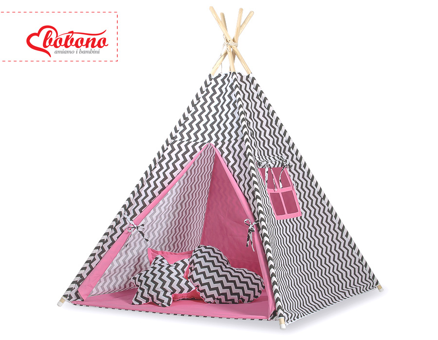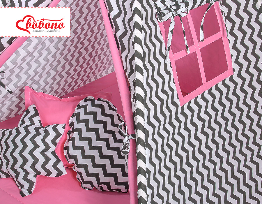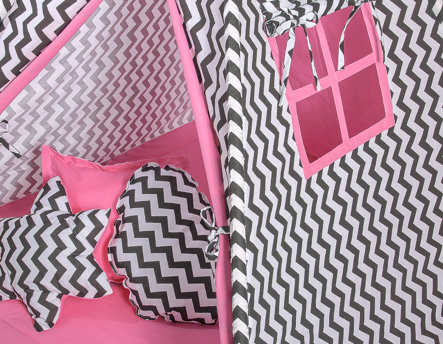 Mega Set: Teepee tent+playmat+pillows - Chevron black/ pink This Teepee is a funtastic childrens play tent - great for imaginative play with friends. To share with friends or to just chill in with some books! Brilliant for a child's bedroom, playroom and can be used outside in the garden.