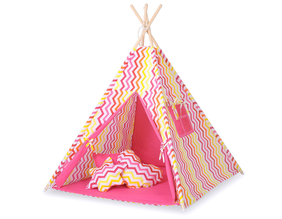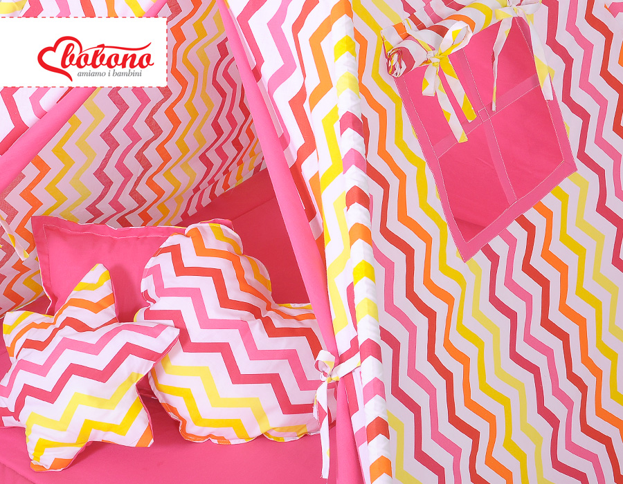 Mega Set: Teepee tent+playmat+pillows - Chevron pink-yellow This Teepee is a funtastic childrens play tent - great for imaginative play with friends. To share with friends or to just chill in with some books! Brilliant for a child's bedroom, playroom and can be used outside in the garden.