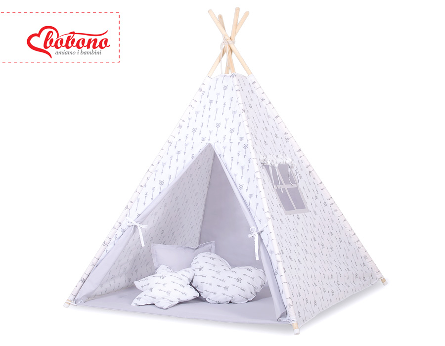MINI Set: Teepee tent for kids + play mat + decorative feathers- Gray arrows This Teepee is a funtastic childrens play tent - great for imaginative play with friends. To share with friends or to just chill in with some books! Brilliant for a child's bedroom, playroom and can be used outside in the garden.