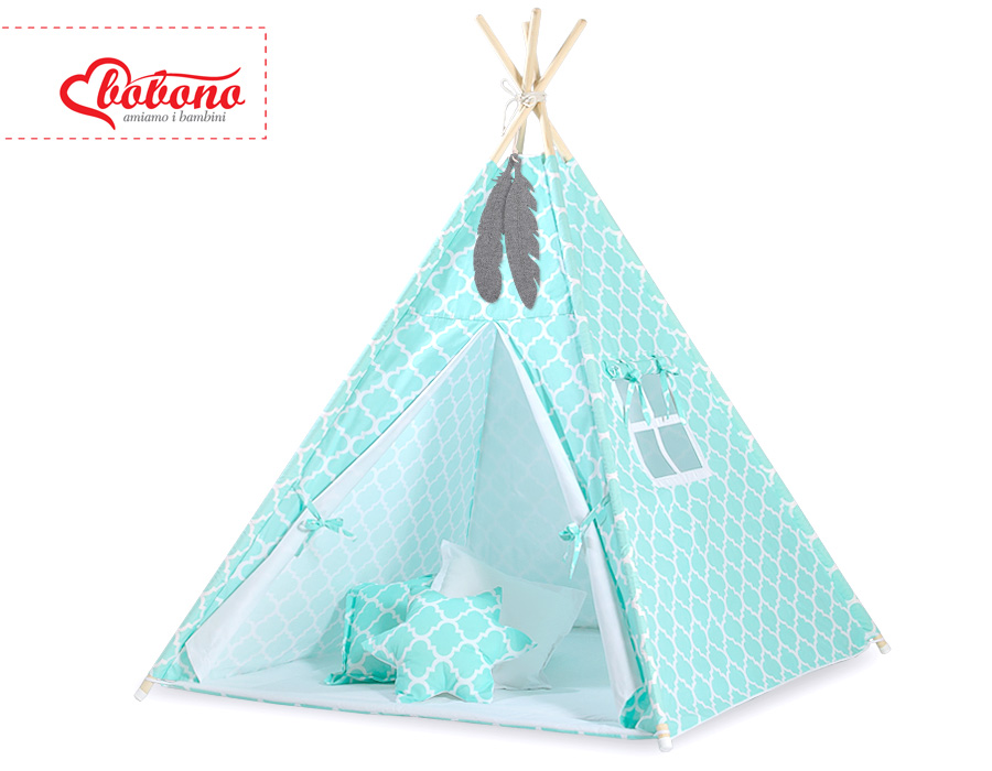MINI Set: Teepee tent for kids + play mat + decorative feathers- Marocco mint This Teepee is a funtastic childrens play tent - great for imaginative play with friends. To share with friends or to just chill in with some books! Brilliant for a child's bedroom, playroom and can be used outside in the garden.