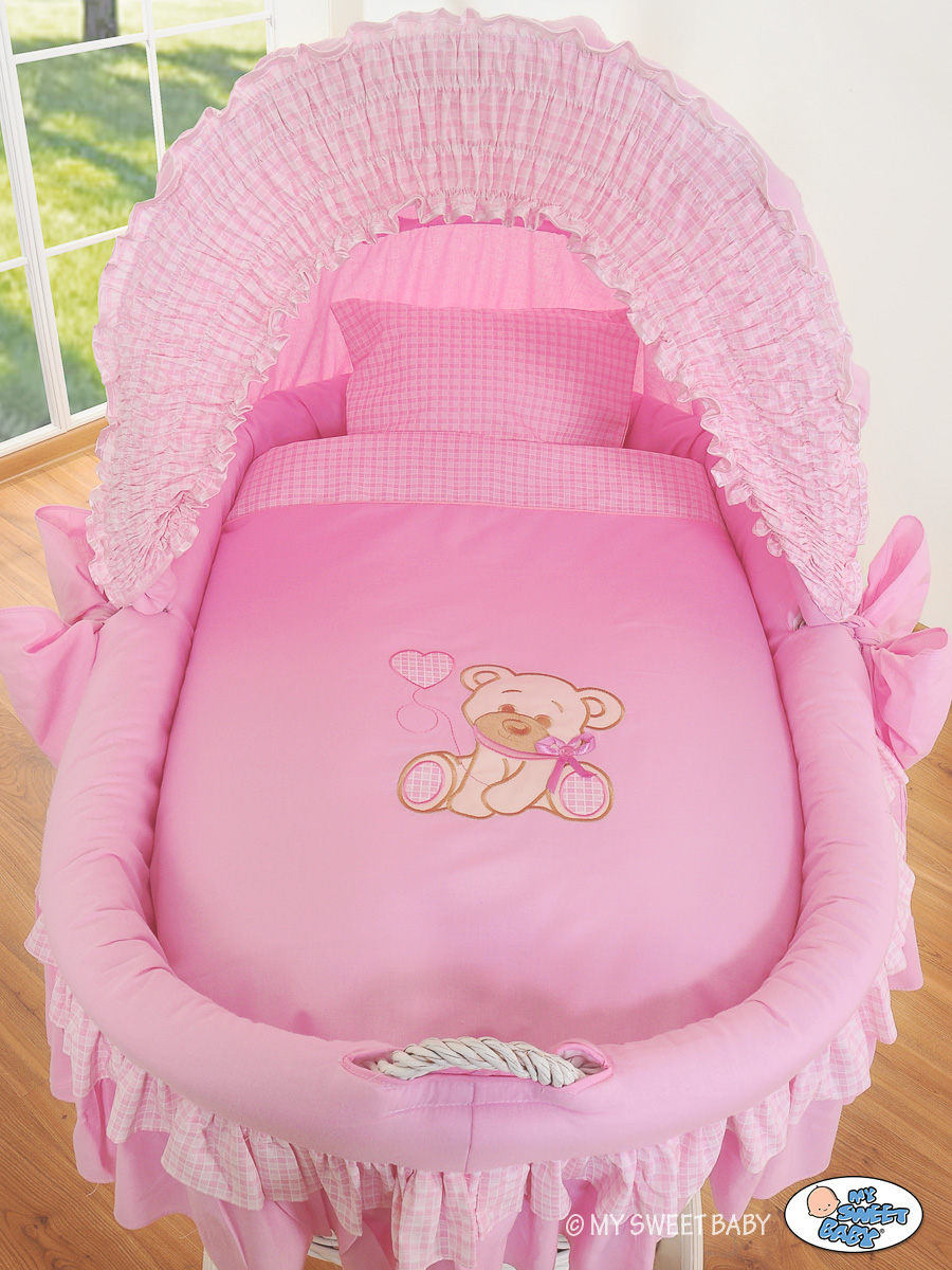 Moses Basket on Wheels - My Sweet Baby Wicker crib with hood- Bear with bow pink