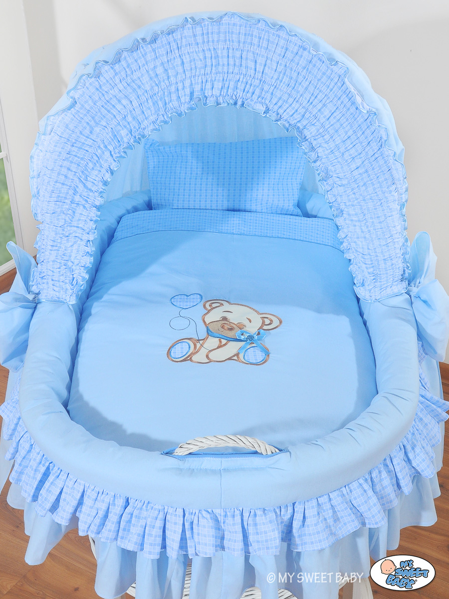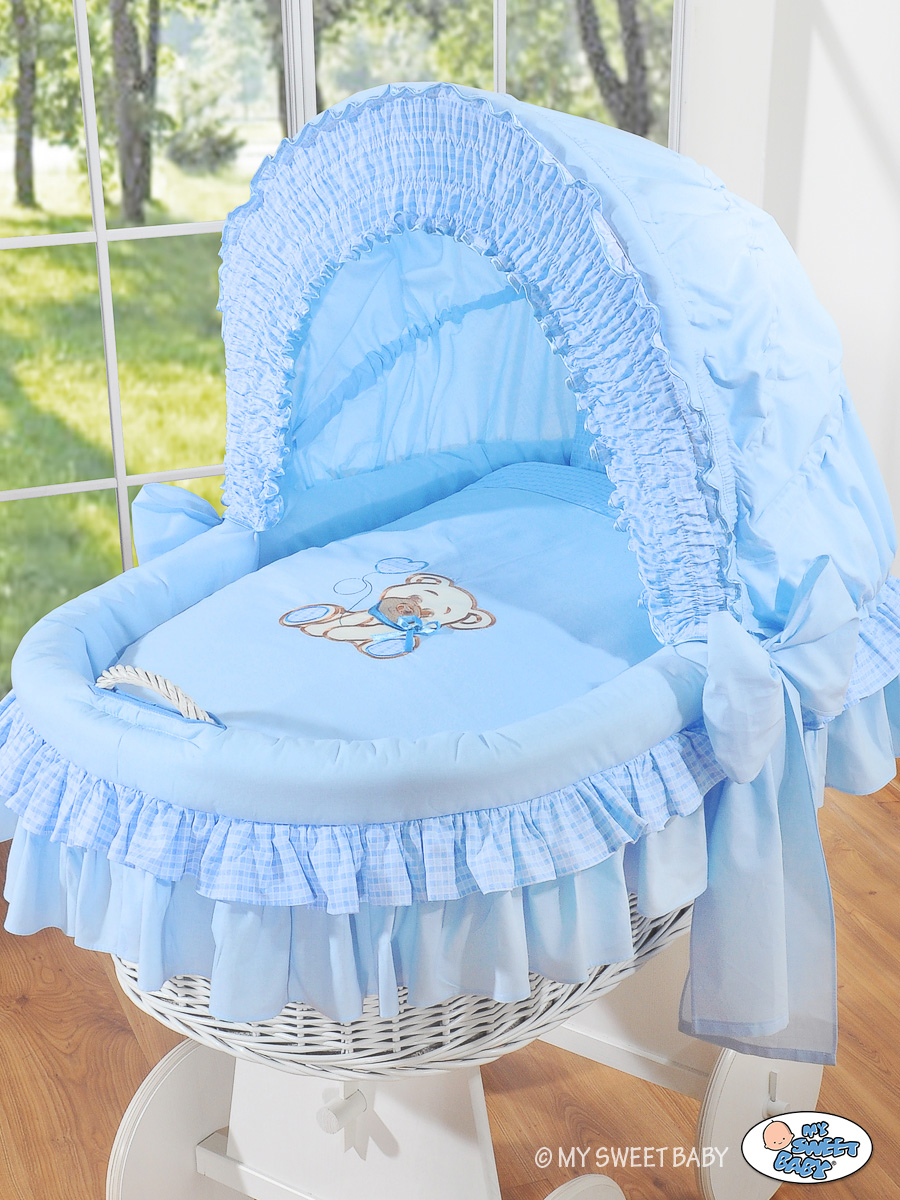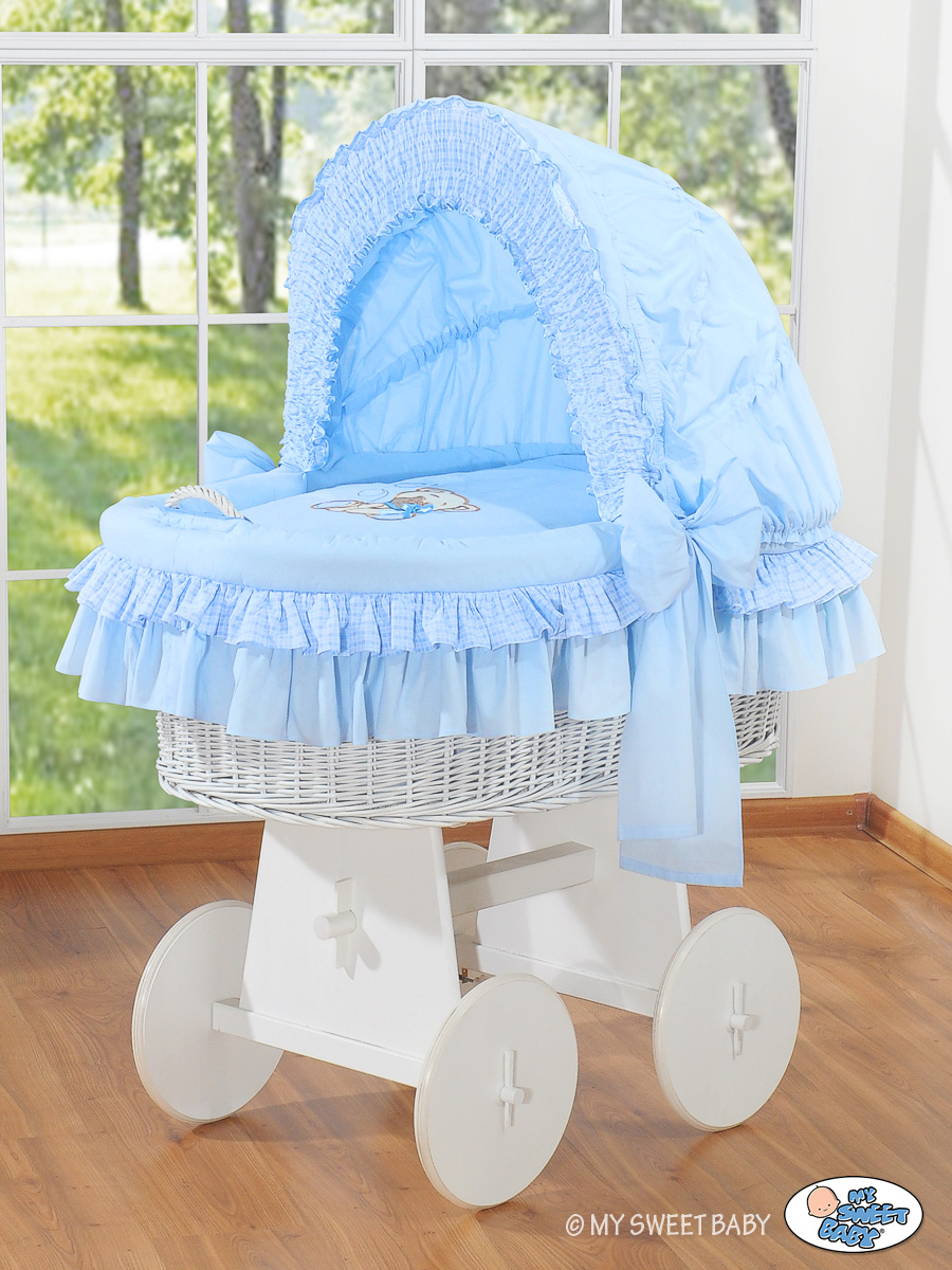 Moses Basket on Wheels - Wicker crib with hood- Bear with bow blue