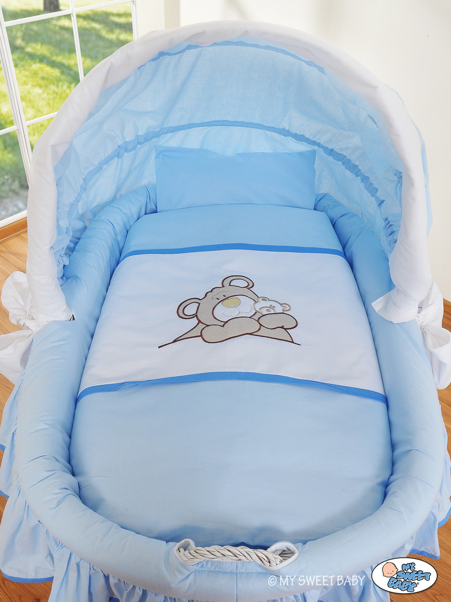 Moses Basket on Wheels - Wicker crib with hood- Teddy Bear Barnaba blau