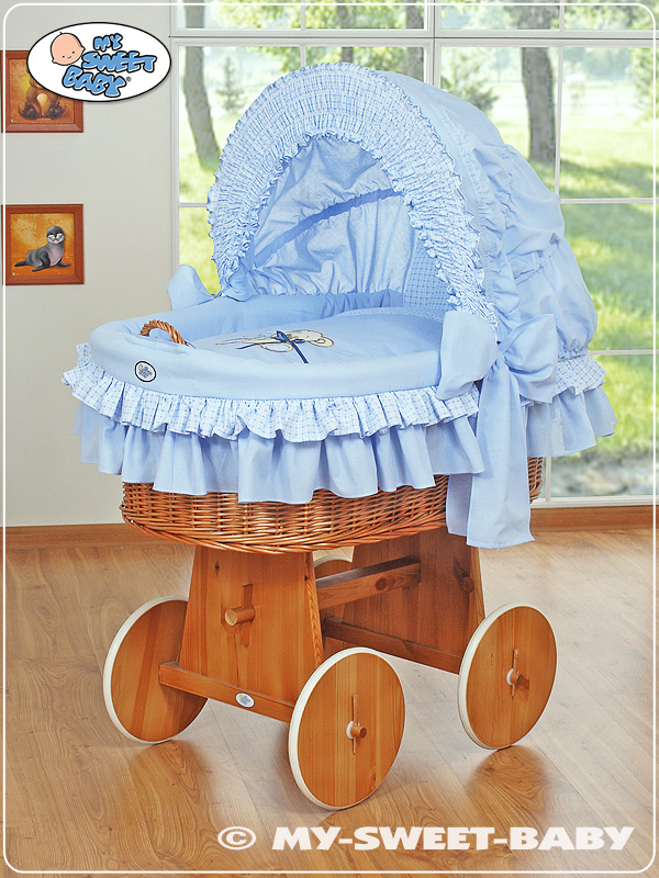 Moses Basket on Wheels - Wicker crib with hood- Teddy Bear with Bow blue
