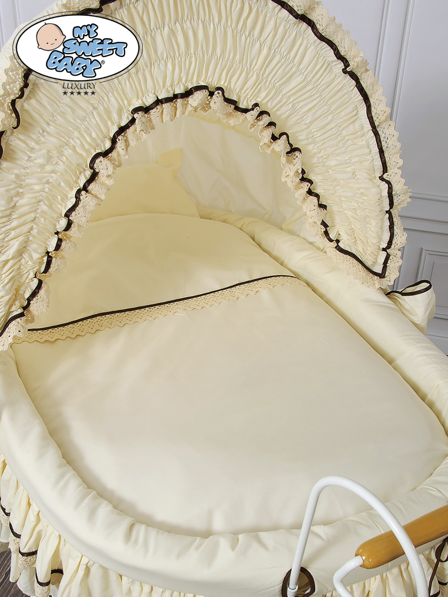 → basket cover with sewn-in soft filling, hood cover, pillow and cover (filling: outer fabric 100% Cotton, padding: 100% Polyester) duvet cover and quilt cover, all from 100 % cotton fabrics