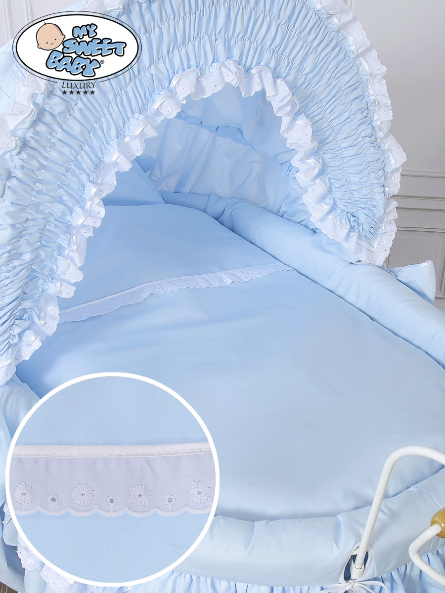 → basket cover with sewn-in soft filling, hood cover, pillow and cover (filling: outer fabric 100% Cotton, padding: 100% Polyester) duvet cover and quilt cover, all from 100 % cotton fabrics