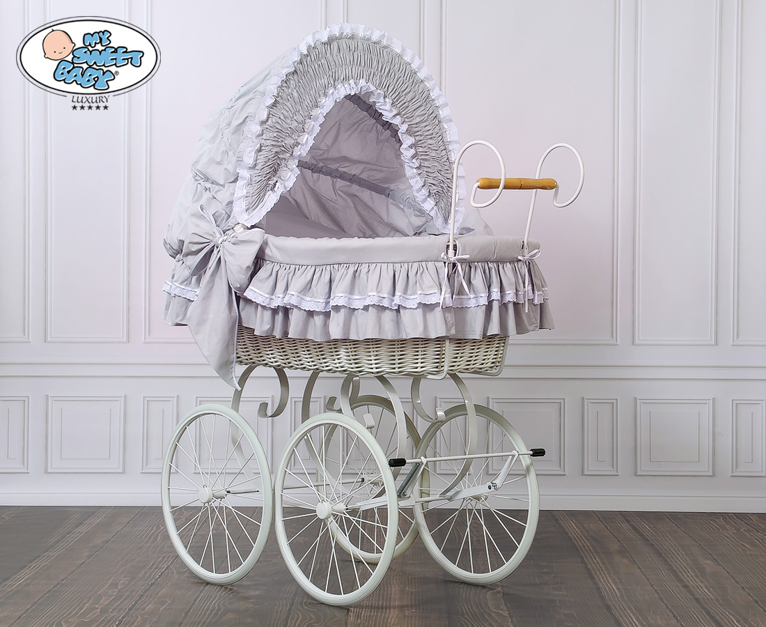 Baskets in retro style on metal, hand-bent metal chassis. With large wheels with rubber tyres. Available versions: natural (black chassis), and white.