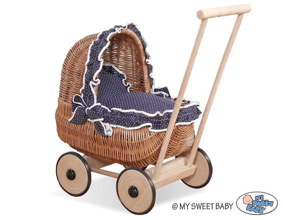 Baby Shop » Baby Toys » Doll prams » Wicker Doll prams » Natural Wicker Dolls Prams » Natural Wicker Dolls Pram Basket Navy Blue Bedding with White Dots