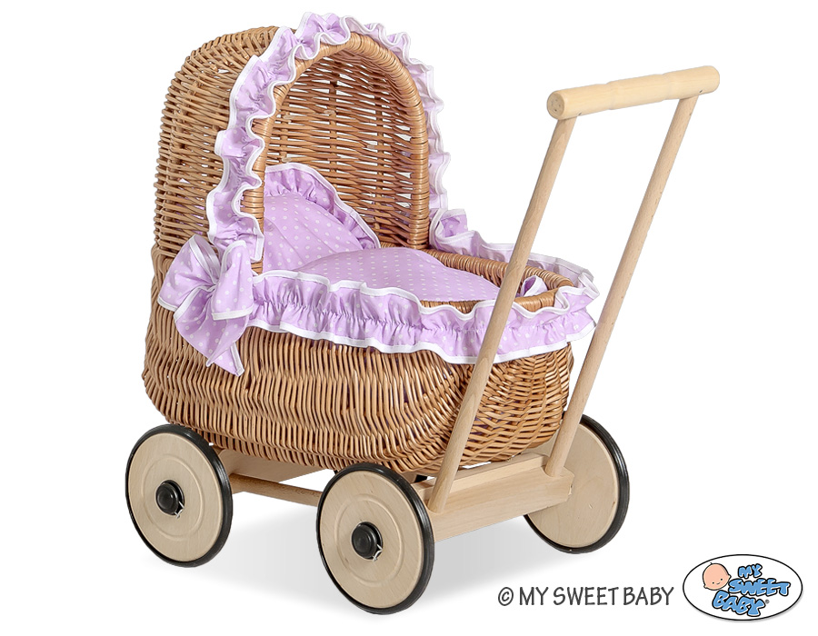 Natural Wicker Dolls Pram Basket Purple with White Dots Dolls Bedding