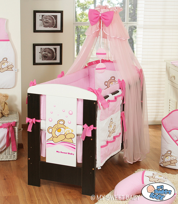 For cot 70x140cm. Pink Barnaba Bear Teddy (L70)- Bumper And Mosquito-net With 5-pcs Bedding Bed Cot Baby Nursery