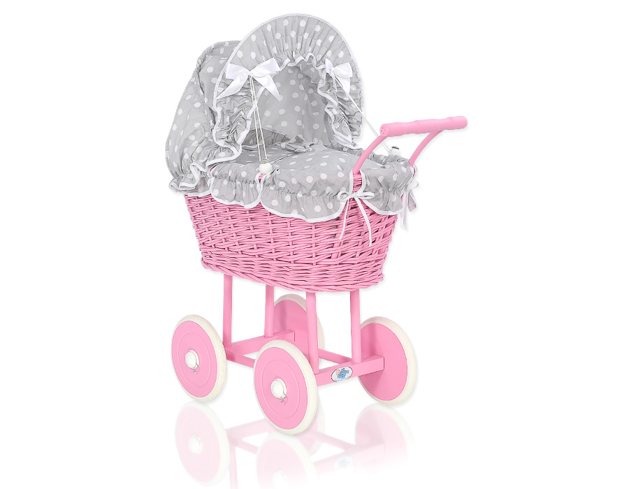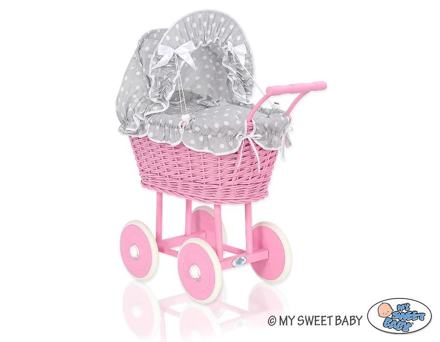 Baby Shop » Baby Toys » Doll prams » Wicker Doll prams » Dark pink » Pink Wicker Doll Carriage Pram Bedding Set White Dots on Gray