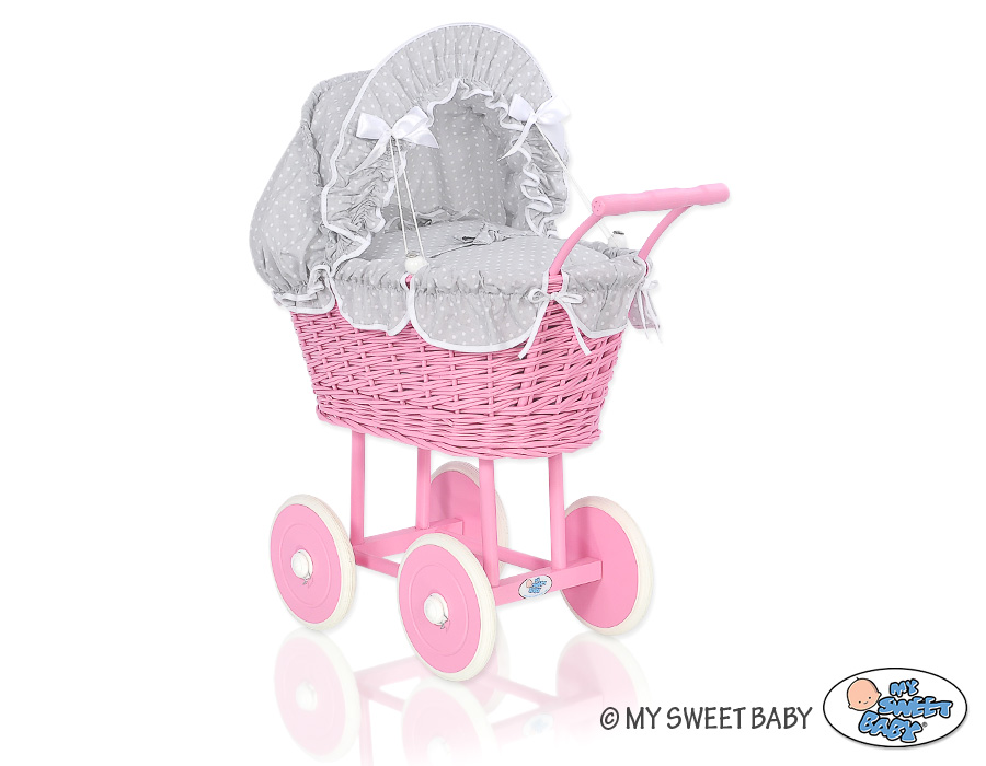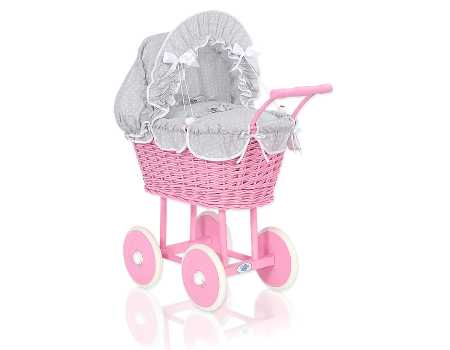Pink Wicker Doll Carriage Pram Gray with White Dots Bedding SetPink Wicker Doll Carriage Pram Gray with White Dots Bedding SetPink Wicker Doll Carriage Pram Gray with White Dots Bedding Set