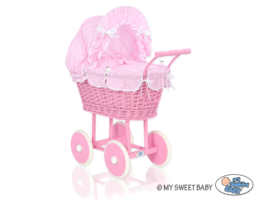 Pink Wicker Doll Carriage Pram Pink Bedding with White Dots