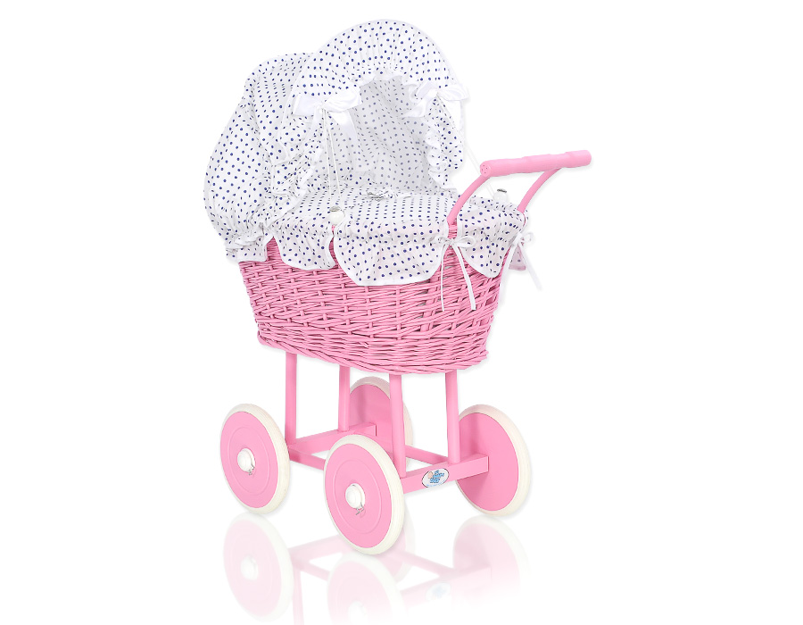 Baby Shop » Baby Toys » Doll prams » Wicker Doll prams » Dark pink » Pink Wicker Doll Carriage Pram White with Navy Blue Dots Bedding Set