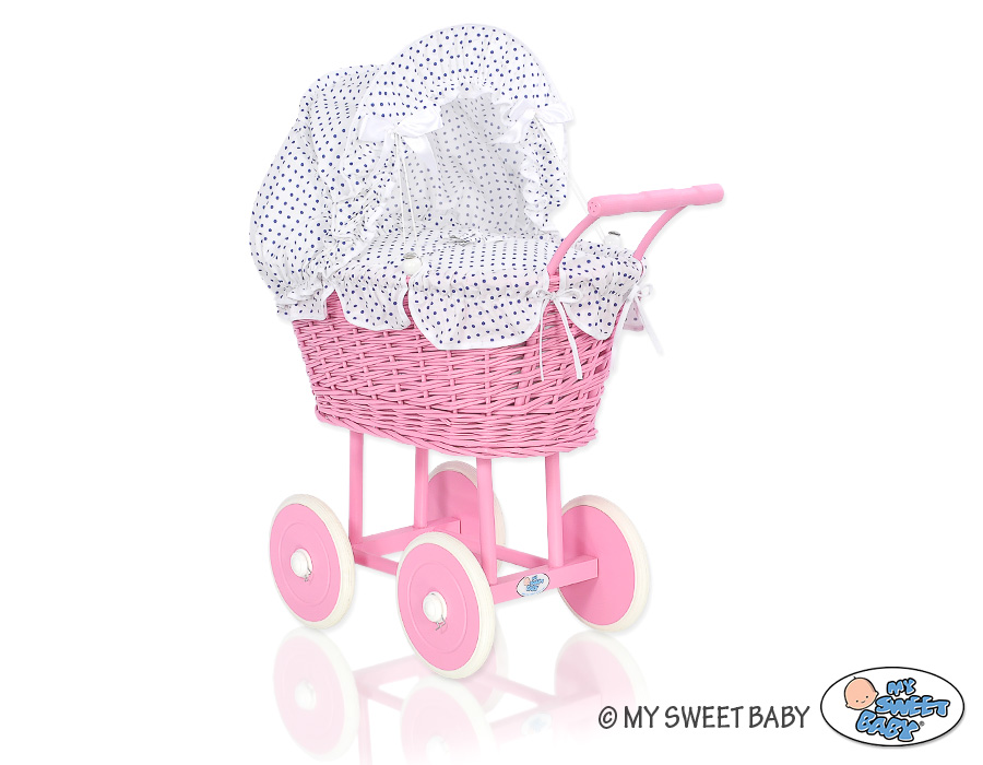 Pink Wicker Doll Carriage Pram White with Navy Blue Dots Bedding Set