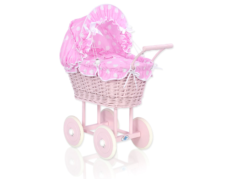 Pink Wicker Doll Pram Carriage Pink with Big White Dots Bedding Set