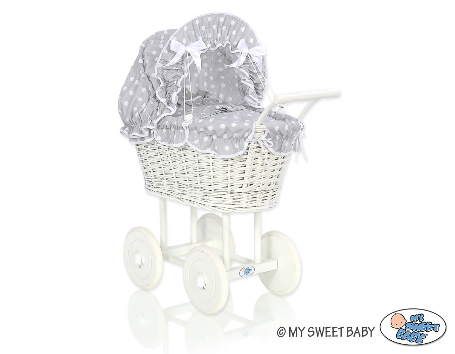 Retro Style White Wicker Doll Pram Bedding Set White Dots on GrayRetro Style White Wicker Doll Pram Bedding Set White Dots on GrayRetro Style White Wicker Doll Pram Bedding Set White Dots on Gray
