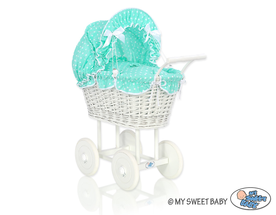 Retro Style White Wicker Doll Pram Bedding Set White Dots on MintRetro Style White Wicker Doll Pram Bedding Set White Dots on MintRetro Style White Wicker Doll Pram Bedding Set White Dots on Mint