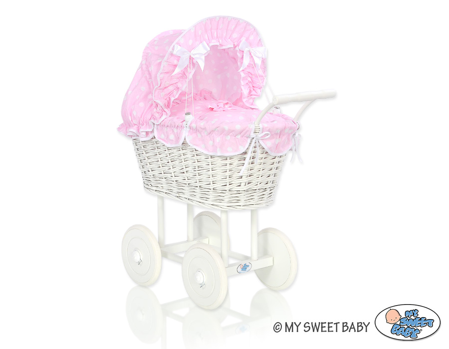 Retro Style White Wicker Doll Pram Bedding Set White Dots on PinkRetro Style White Wicker Doll Pram Bedding Set White Dots on PinkRetro Style White Wicker Doll Pram Bedding Set White Dots on Pink