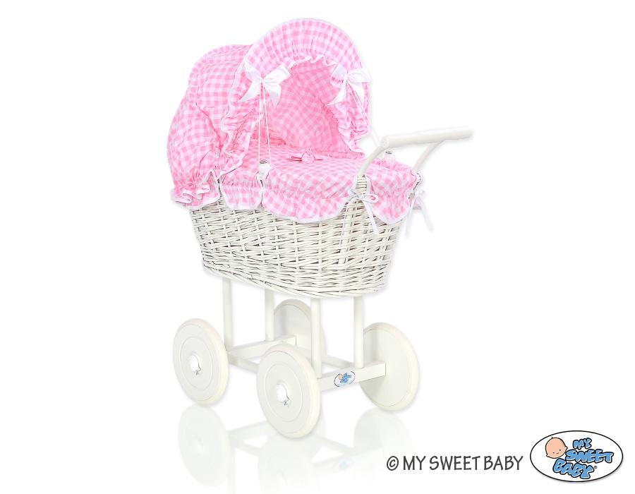Baby Shop » Baby Toys » Doll prams » Wicker Doll prams » White Wicker Dolls Prams » Retro Style White Wicker Doll Pram Pink White Checkered Bedding Set