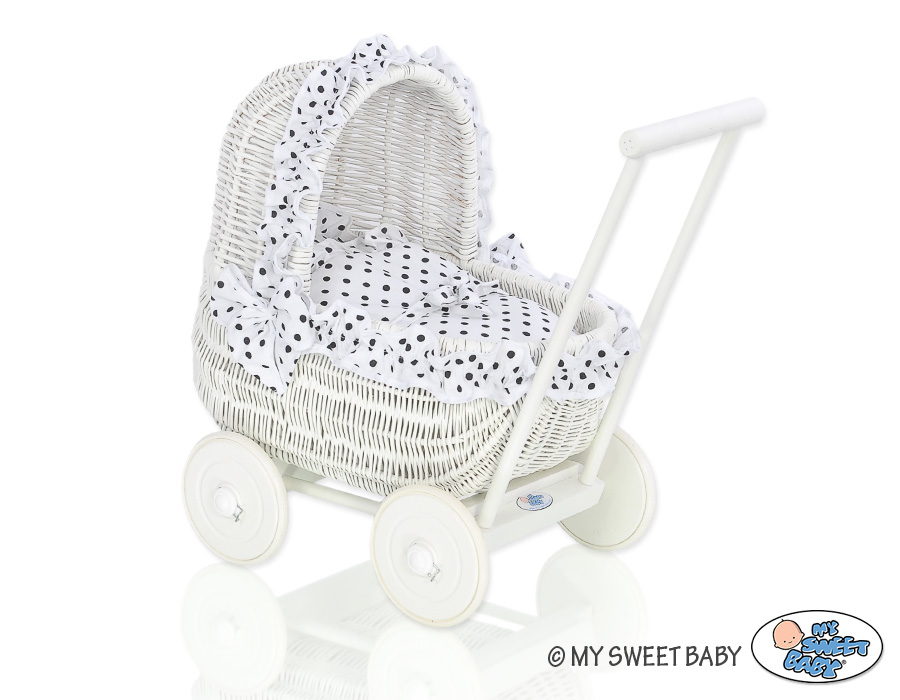 Baby Shop » Baby Toys » Doll prams » Wicker Doll prams » White Wicker Dolls Prams » Retro Style White Wicker Doll Pram White with Black Dots Bedding Set