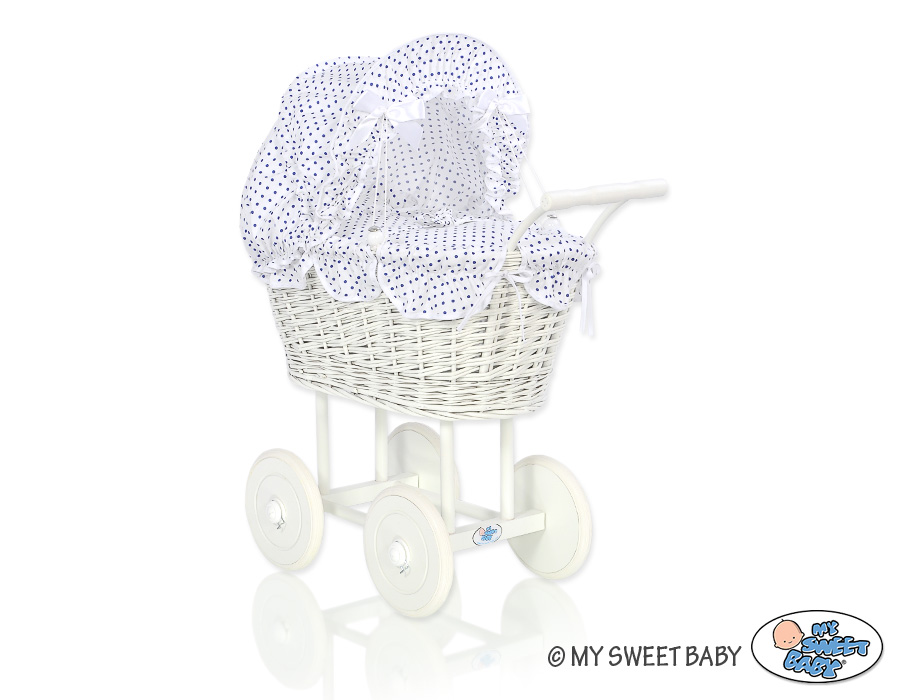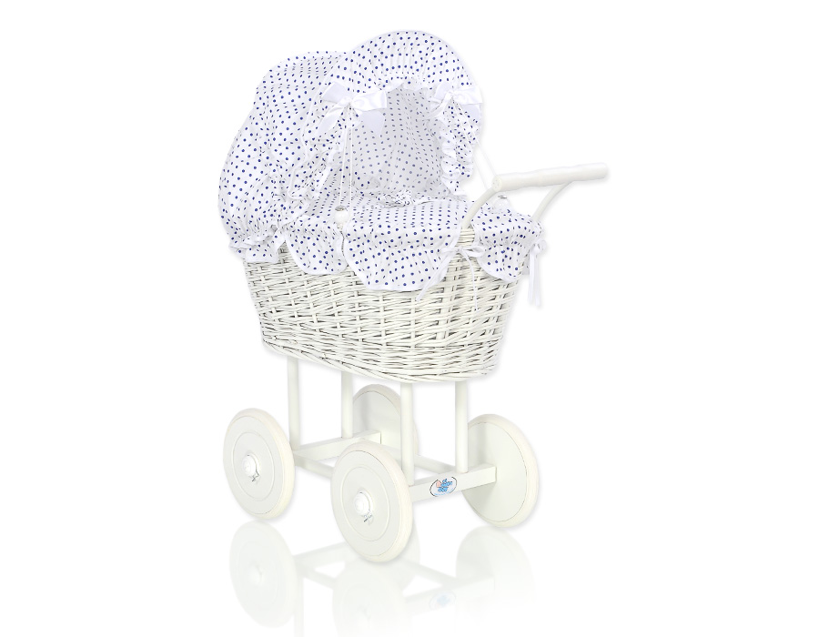 Baby Shop » Baby Toys » Doll prams » Wicker Doll prams » White Wicker Dolls Prams » Retro Style White Wicker Doll Pram White with Navy Blue Dots Bedding Set