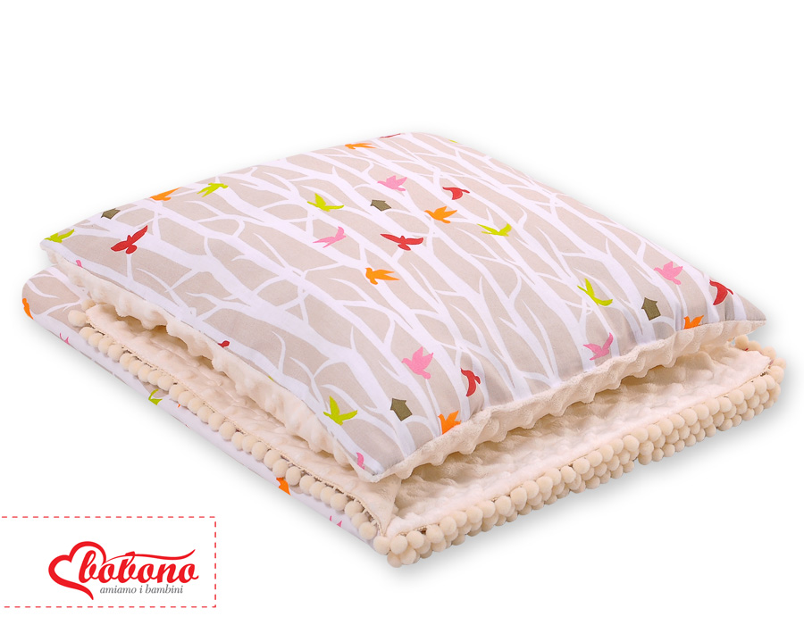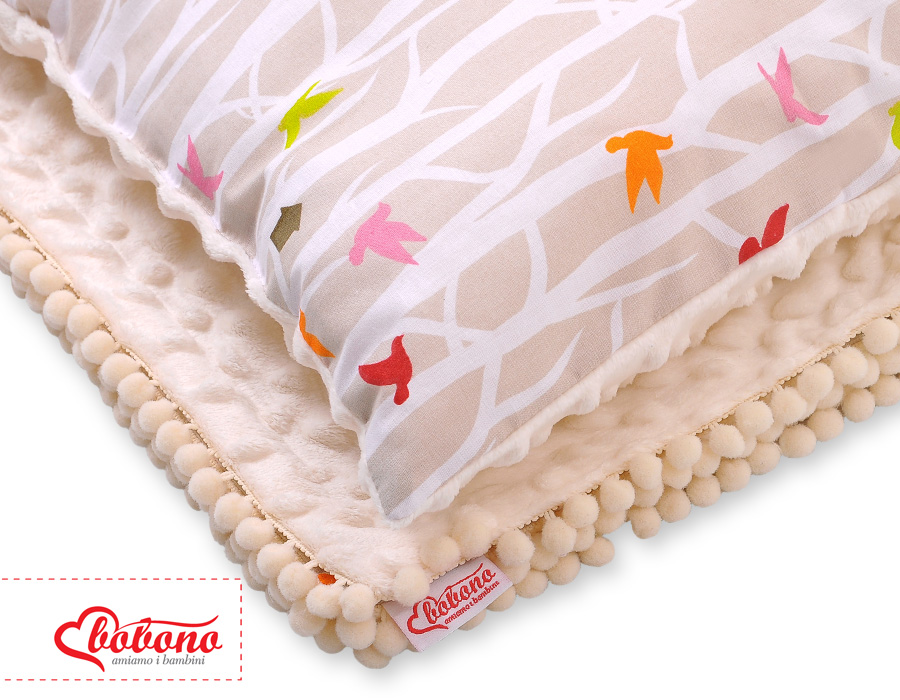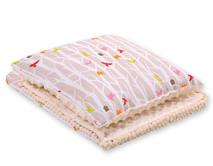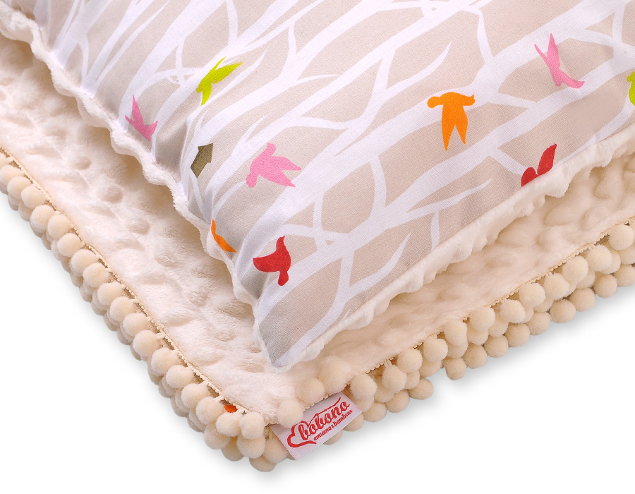 Soft, comfortable baby reversible pillow and blanket with pompons. Ideal for road and at home.