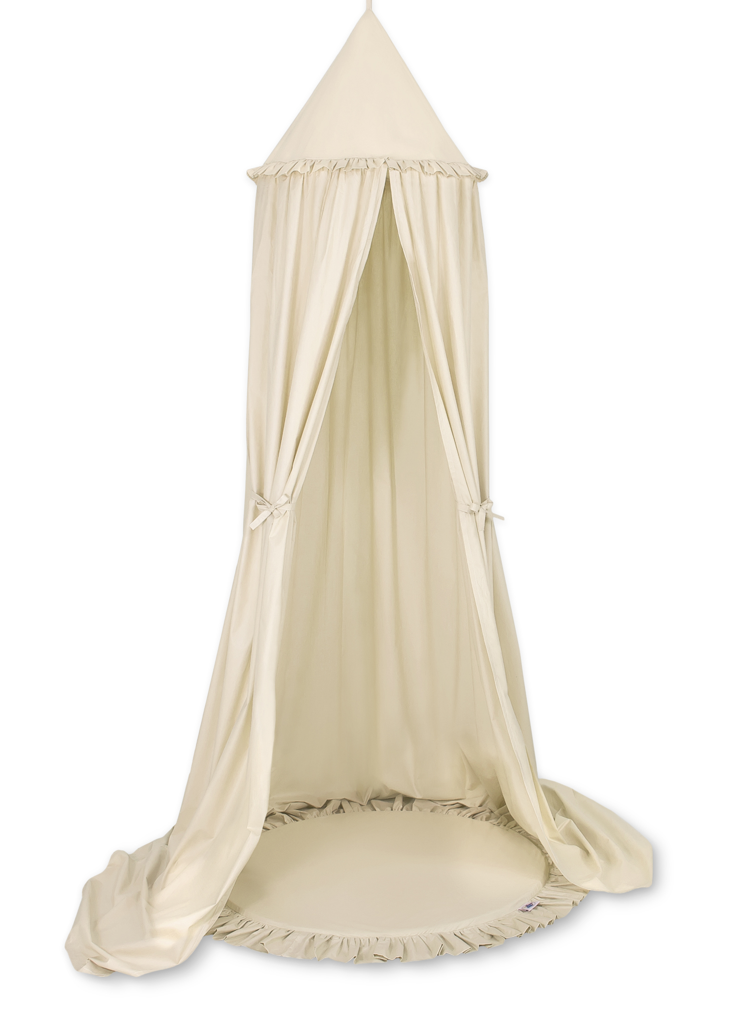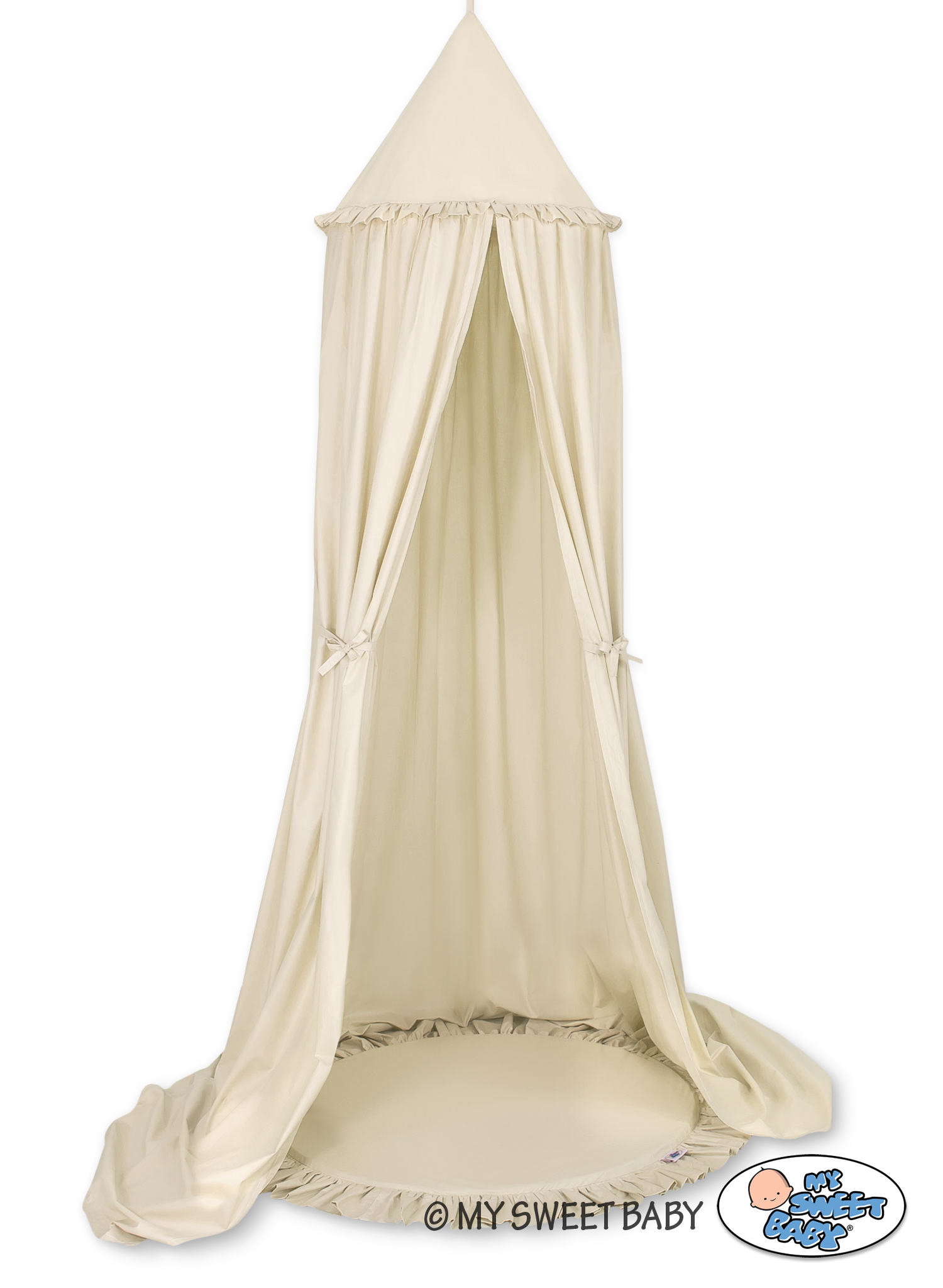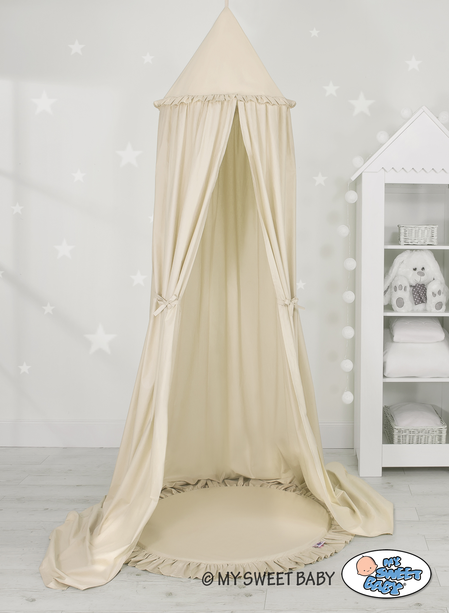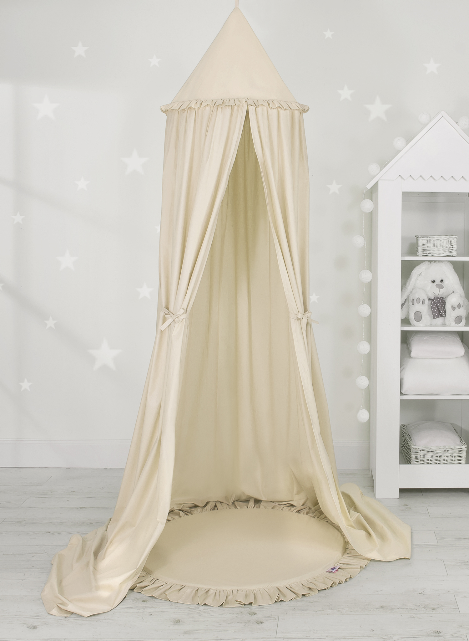 An effective long hanging canopy. A beautiful element it the children's room. It can be used as a unique decoration of a baby cot, as well as it can create a wonderful place to play. Hanging over the cot protect the canopy against too much light and noise creating a cozy and safe place to rest inside the cot. The canopy can be easily mounted to the ceiling. The length of 260 cm allows to arrange the ends on the floor. This creates a perfect hiding place and playground for older children. The canopy is made of Okotex certificated, 100% cotton fabric. On the sides there are practical ribbons for tying the canopy and create a beautiful tent. The rim on the top can be removed. The fabric is washable by 30 Degrees. Combined with soft and comfy floor mat it will become a perfect place for fun. The mat has a soft filling that perfectly isolates from the hard and cold floor. The cover is made of OKOTEX certified 100% cotton. The bottom of the play mat is made of a modern, anti-allergic, attested material. The bottom can be removed and the cover can be washed.