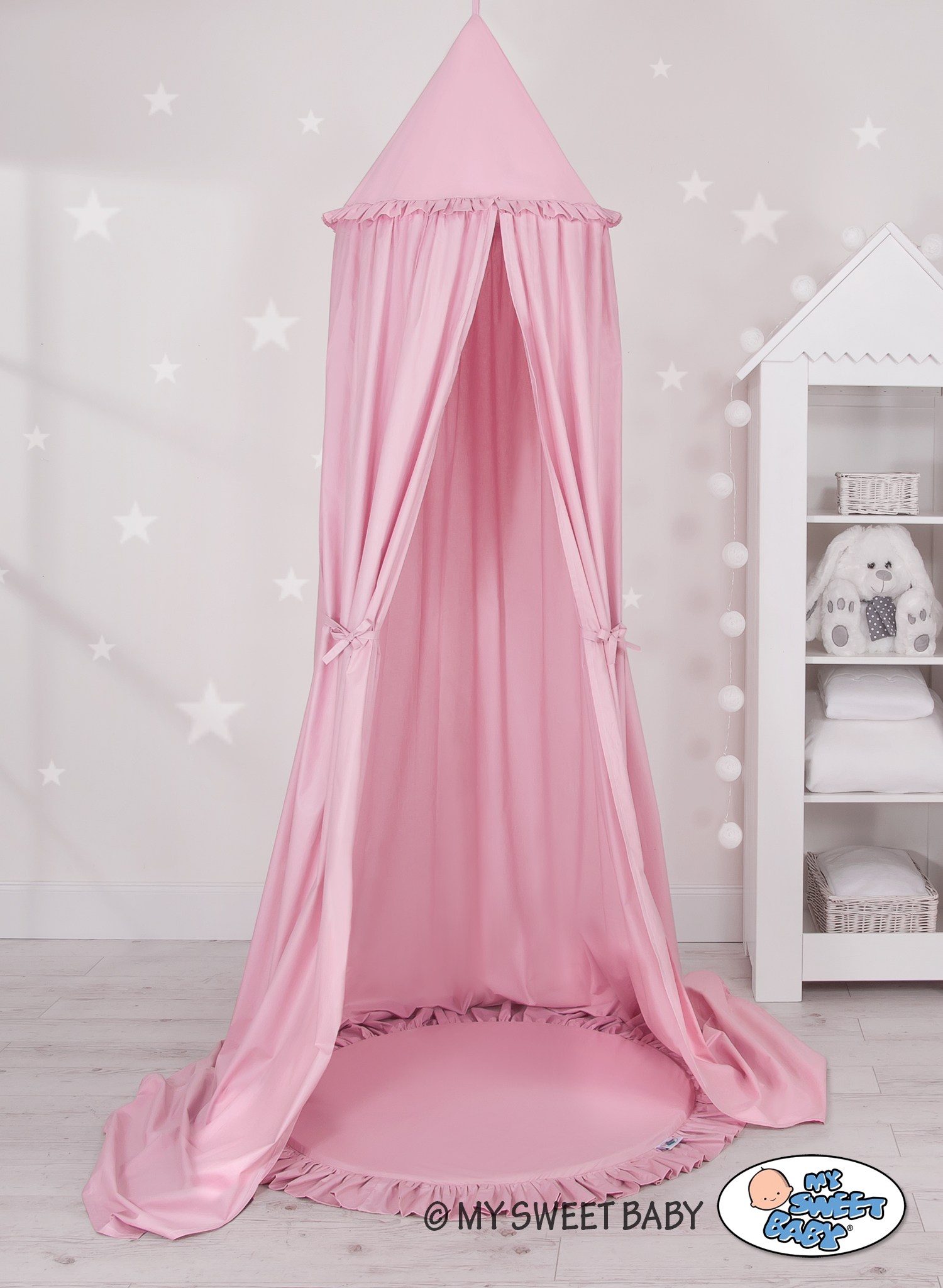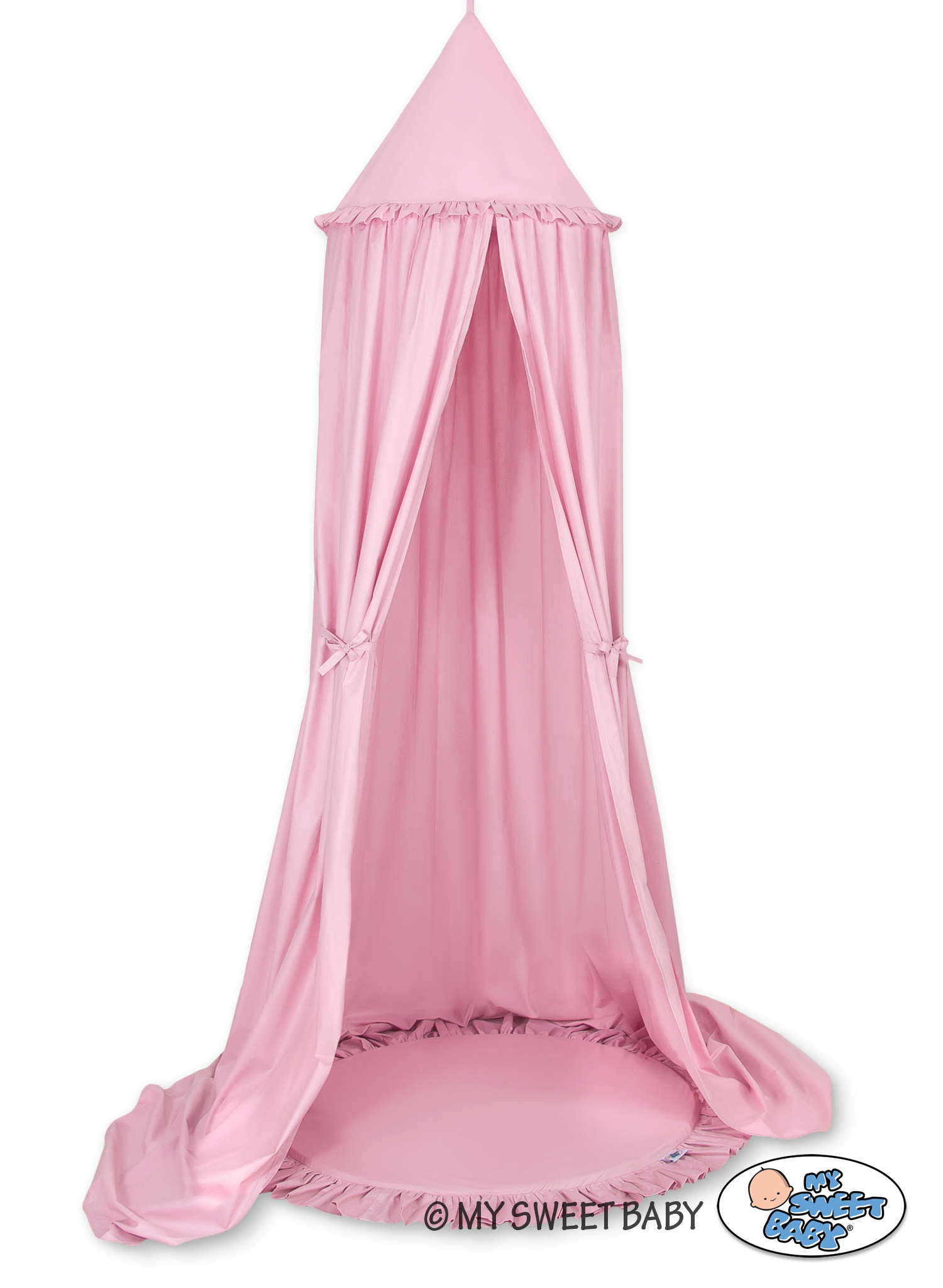 An effective long hanging canopy. A beautiful element it the children's room. It can be used as a unique decoration of a baby cot, as well as it can create a wonderful place to play. Hanging over the cot protect the canopy against too much light and noise creating a cozy and safe place to rest inside the cot. The canopy can be easily mounted to the ceiling. The length of 260 cm allows to arrange the ends on the floor. This creates a perfect hiding place and playground for older children. The canopy is made of Okotex certificated, 100% cotton fabric. On the sides there are practical ribbons for tying the canopy and create a beautiful tent. The rim on the top can be removed. The fabric is washable by 30 Degrees. Combined with soft and comfy floor mat it will become a perfect place for fun. The mat has a soft filling that perfectly isolates from the hard and cold floor. The cover is made of OKOTEX certified 100% cotton. The bottom of the play mat is made of a modern, anti-allergic, attested material. The bottom can be removed and the cover can be washed.