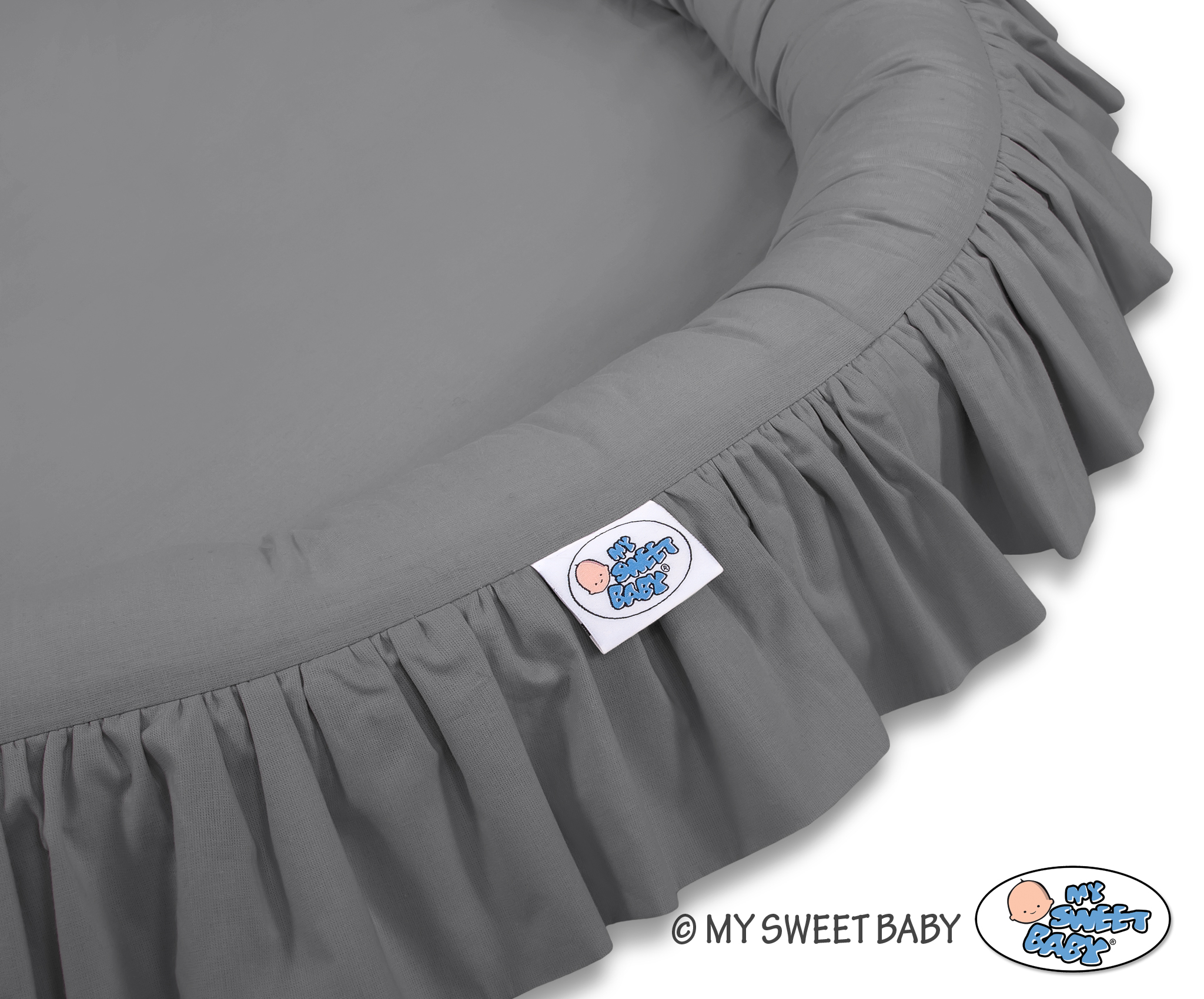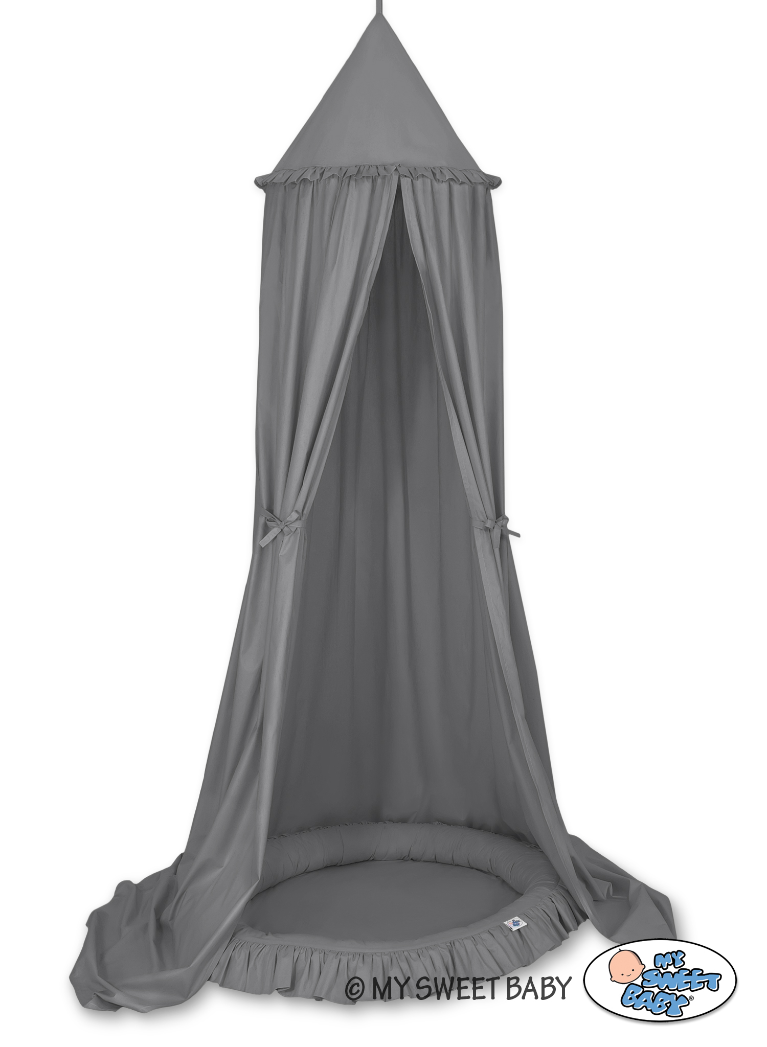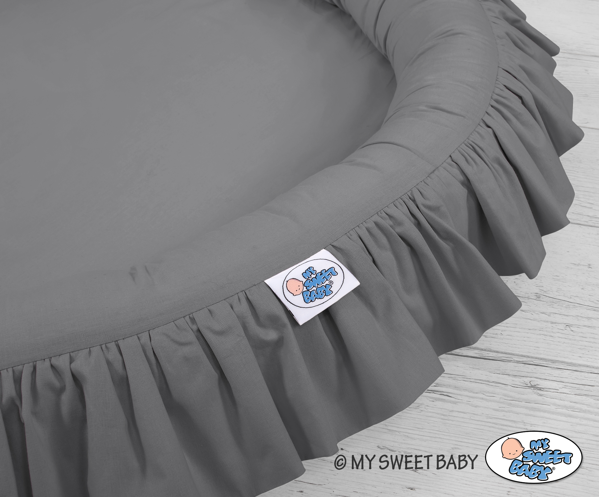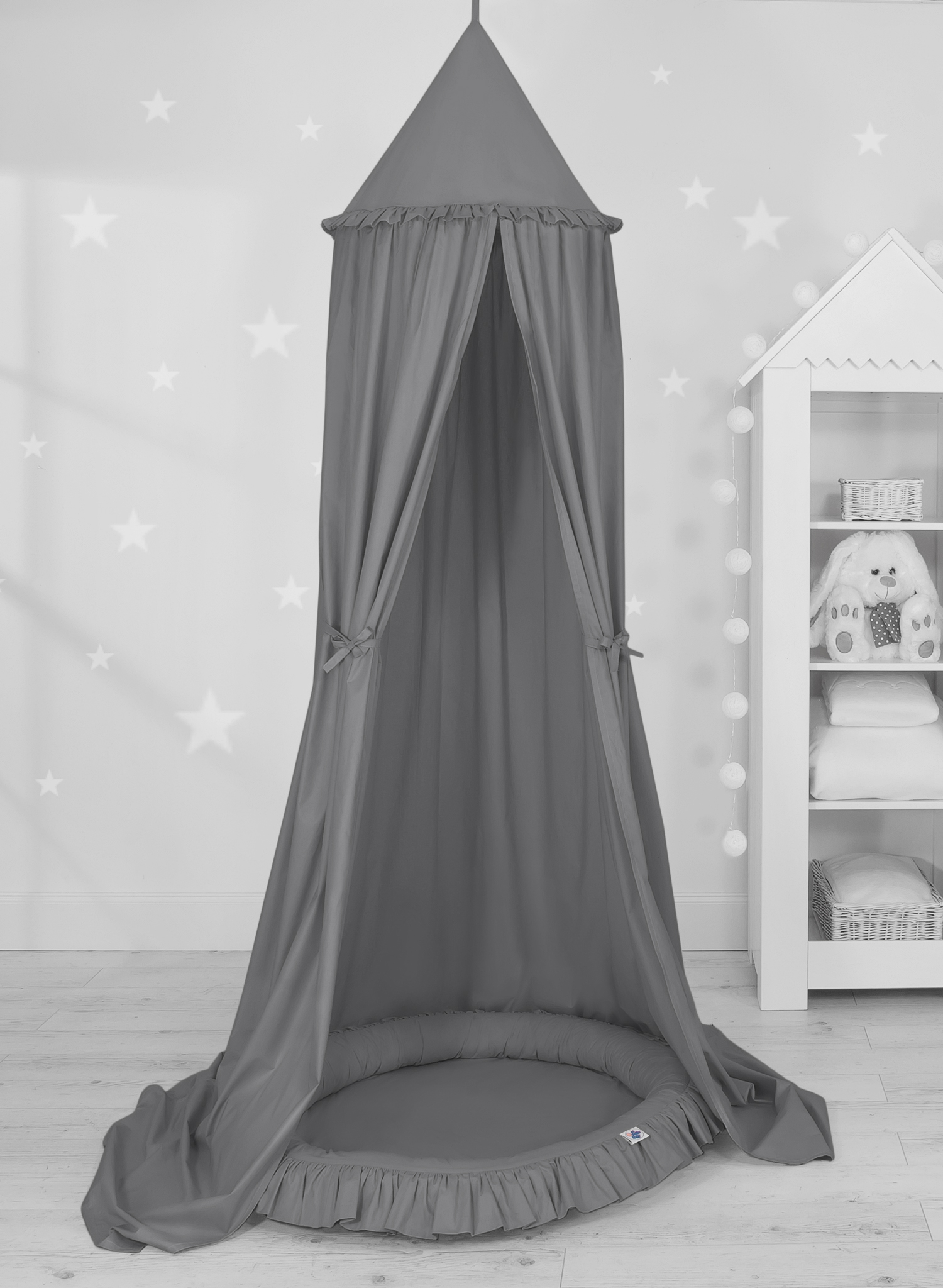An effective long hanging canopy. A beautiful element it the children's room. It can be used as a unique decoration of a baby cot, as well as it can create a wonderful place to play. Hanging over the cot protect the canopy against too much light and noise creating a cozy and safe place to rest inside the cot. The canopy can be easily mounted to the ceiling. The length of 260 cm allows to arrange the ends on the floor. This creates a perfect hiding place and playground for older children. The canopy is made of Okotex certificated, 100% cotton fabric. On the sides there are practical ribbons for tying the canopy and create a beautiful tent. The rim on the top can be removed. The fabric is washable by 30 Degrees. Combined with lovely nest with a flounce it will become a perfect place for fun. The soft edges provide safety for the babies. The edge is filled with approved, non-allergenic filling: Eco -Fillball fibers. They are soft, resilience and they assure the proper air circulation. The bottom of the baby nest with flounce is made of a modern, anti-allergenic, attested material. The bottom inlay can be removed and the cover can be washed at 30 degrees.