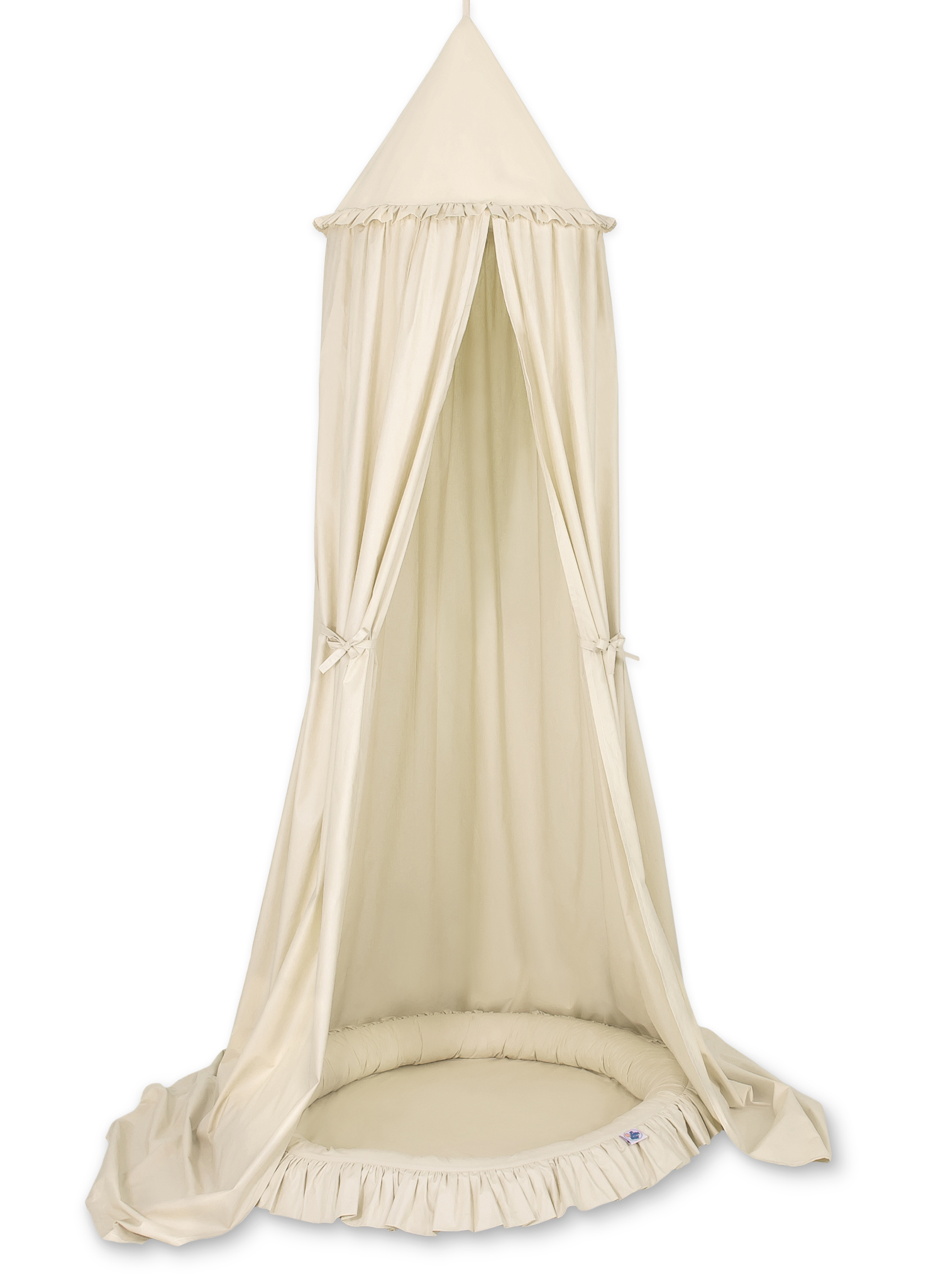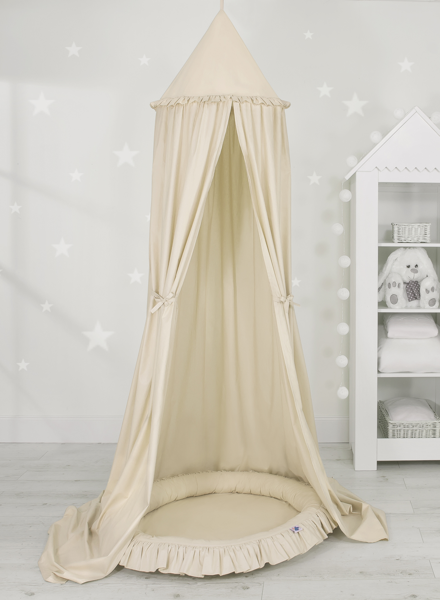 An effective long hanging canopy. A beautiful element it the children's room. It can be used as a unique decoration of a baby cot, as well as it can create a wonderful  place to play. Hanging over the cot protect the canopy against too much light and noise creating a cozy  and safe place to rest inside the cot. The canopy can be easily mounted to the ceiling. The length of 260 cm allows to arrange the ends on the floor. This creates a perfect hiding place and playground for older children. The canopy is made of Okotex certificated, 100% cotton fabric. On the sides there are practical ribbons for tying the canopy and create a beautiful tent. The rim on the top can be removed. The fabric is washable by 30 Degrees. Combined with lovely nest with a flounce it will become a perfect place for fun. The soft edges provide safety for the babies. The edge is filled with approved, non-allergenic filling: Eco -Fillball fibers. They are soft, resilience and they assure the proper air circulation. The bottom of the baby nest with flounce is made of a modern, anti-allergenic, attested material. The bottom inlay can be removed and the cover can be washed at 30 degrees