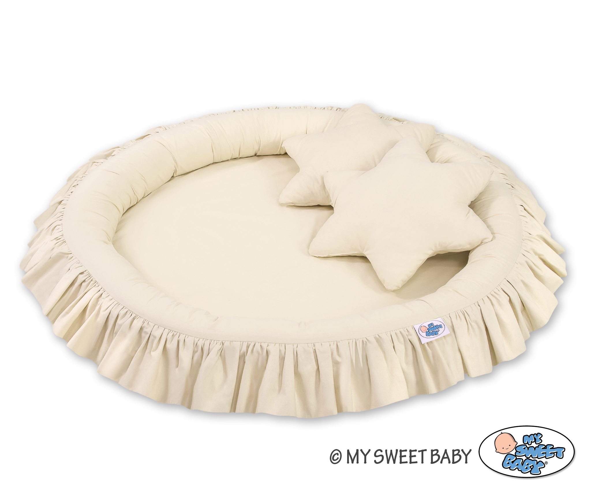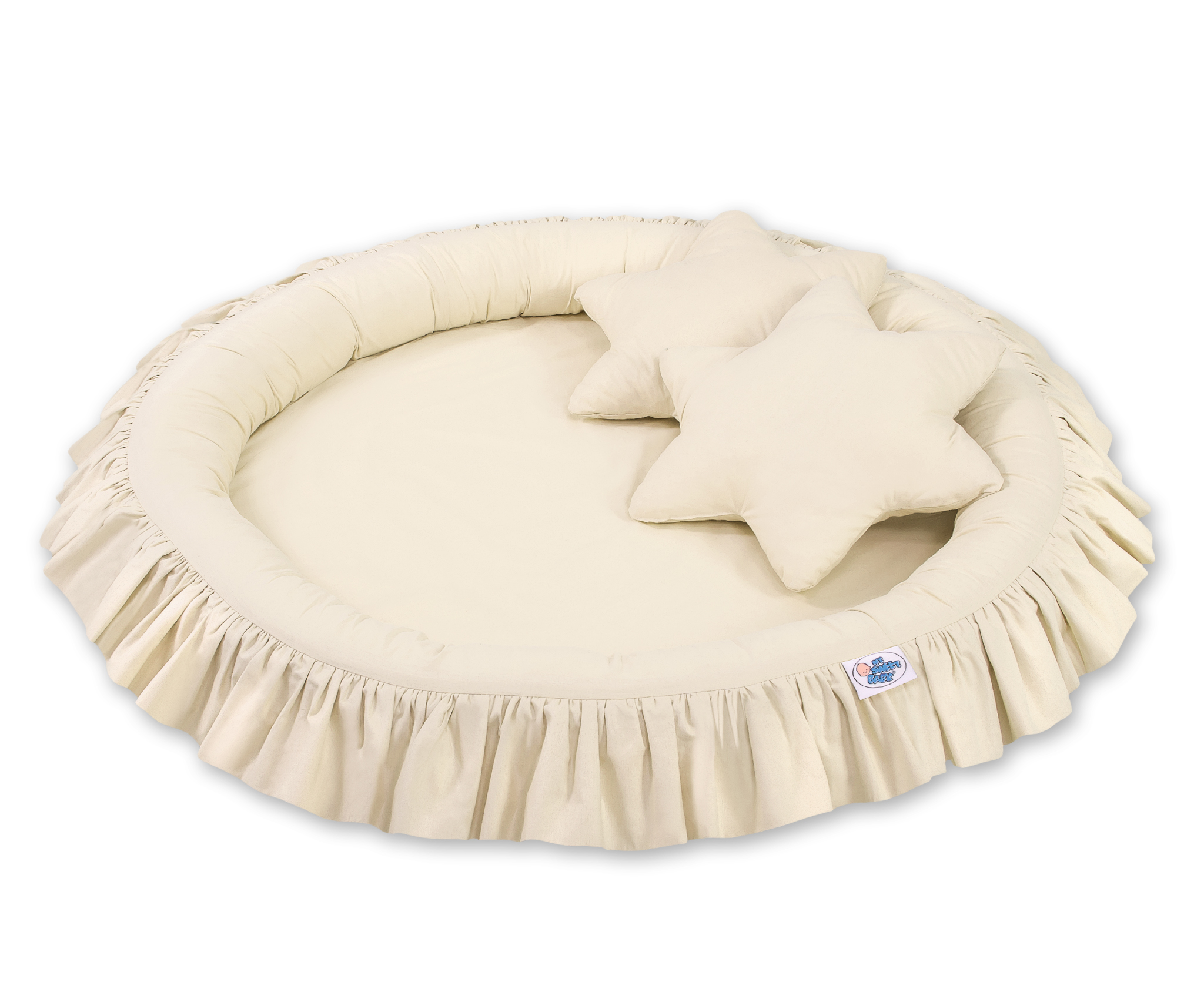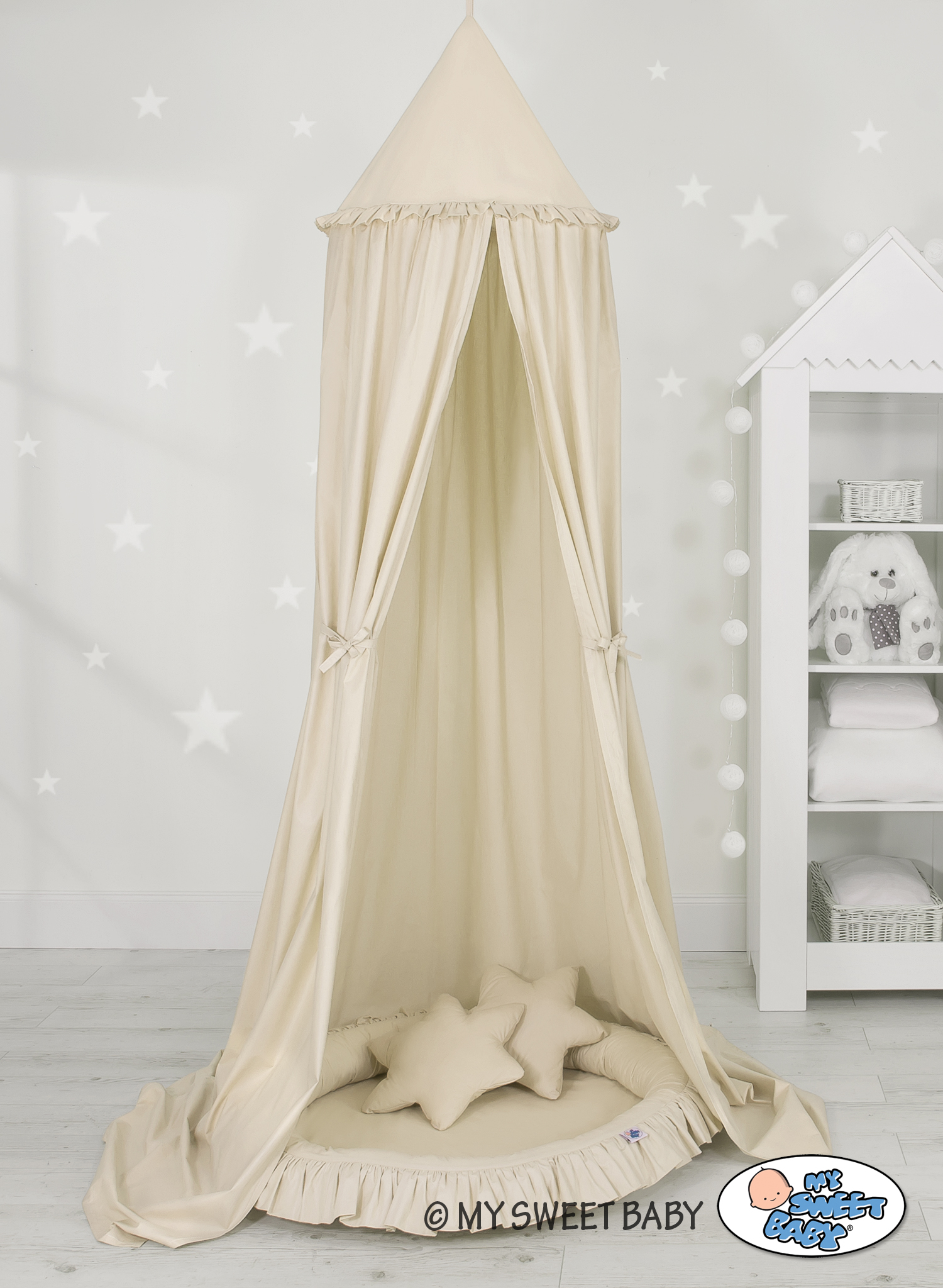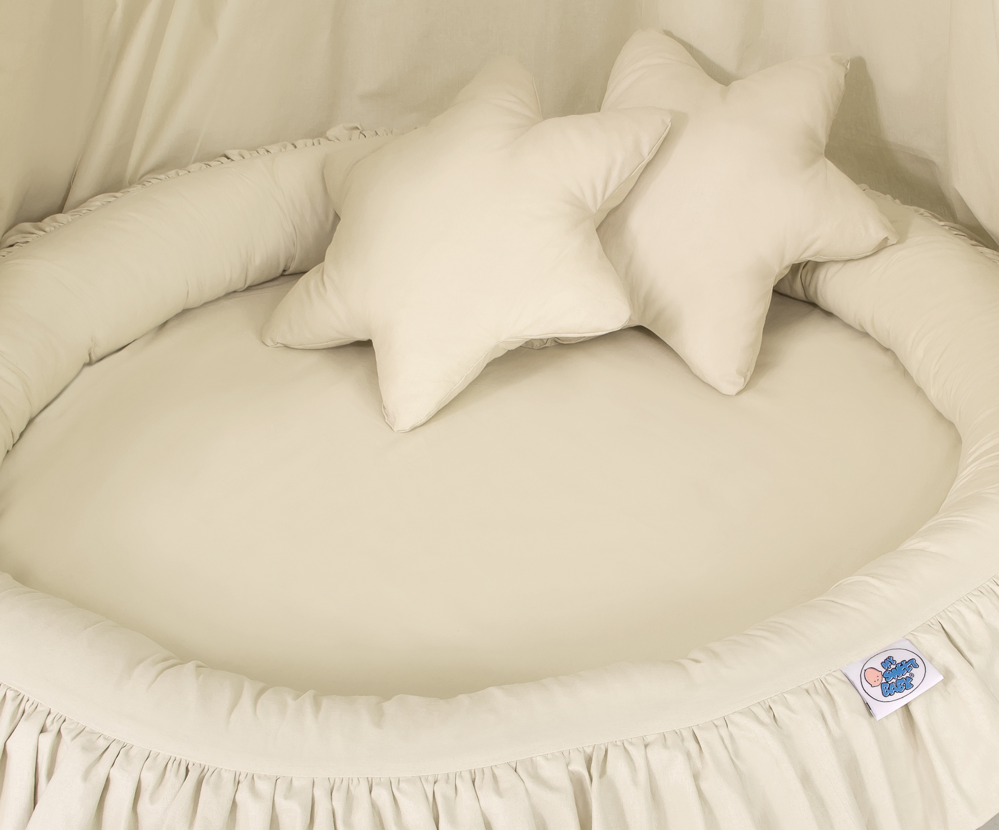 An effective long hanging canopy. A beautiful element it the children's room. It can be used as a unique decoration of a baby cot, as well as it can create a wonderful place to play. Hanging over the cot protect the canopy against too much light and noise creating a cozy and safe place to rest inside the cot. The canopy can be easily mounted to the ceiling. The length of 260 cm allows to arrange the ends on the floor. This creates a perfect hiding place and playground for older children. The canopy is made of Okotex certificated, 100% cotton fabric. On the sides there are practical ribbons for tying the canopy and create a beautiful tent. The rim on the top can be removed. The fabric is washable by 30 Degrees. Combined with lovely nest with a flounce it will become a perfect place for fun. The soft edges provide safety for the babies. The edge is filled with approved, non-allergenic filling: Eco -Fillball fibers. They are soft, resilience and they assure the proper air circulation. The bottom of the baby nest with flounce is made of a modern, anti-allergenic, attested material. The bottom inlay can be removed and the cover can be washed at 30 degrees.