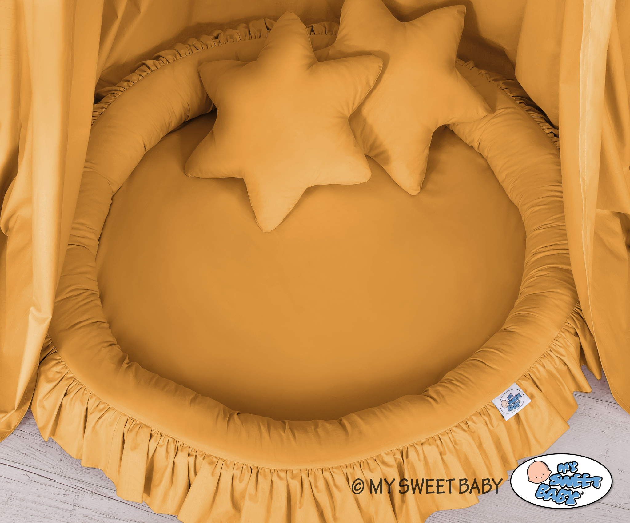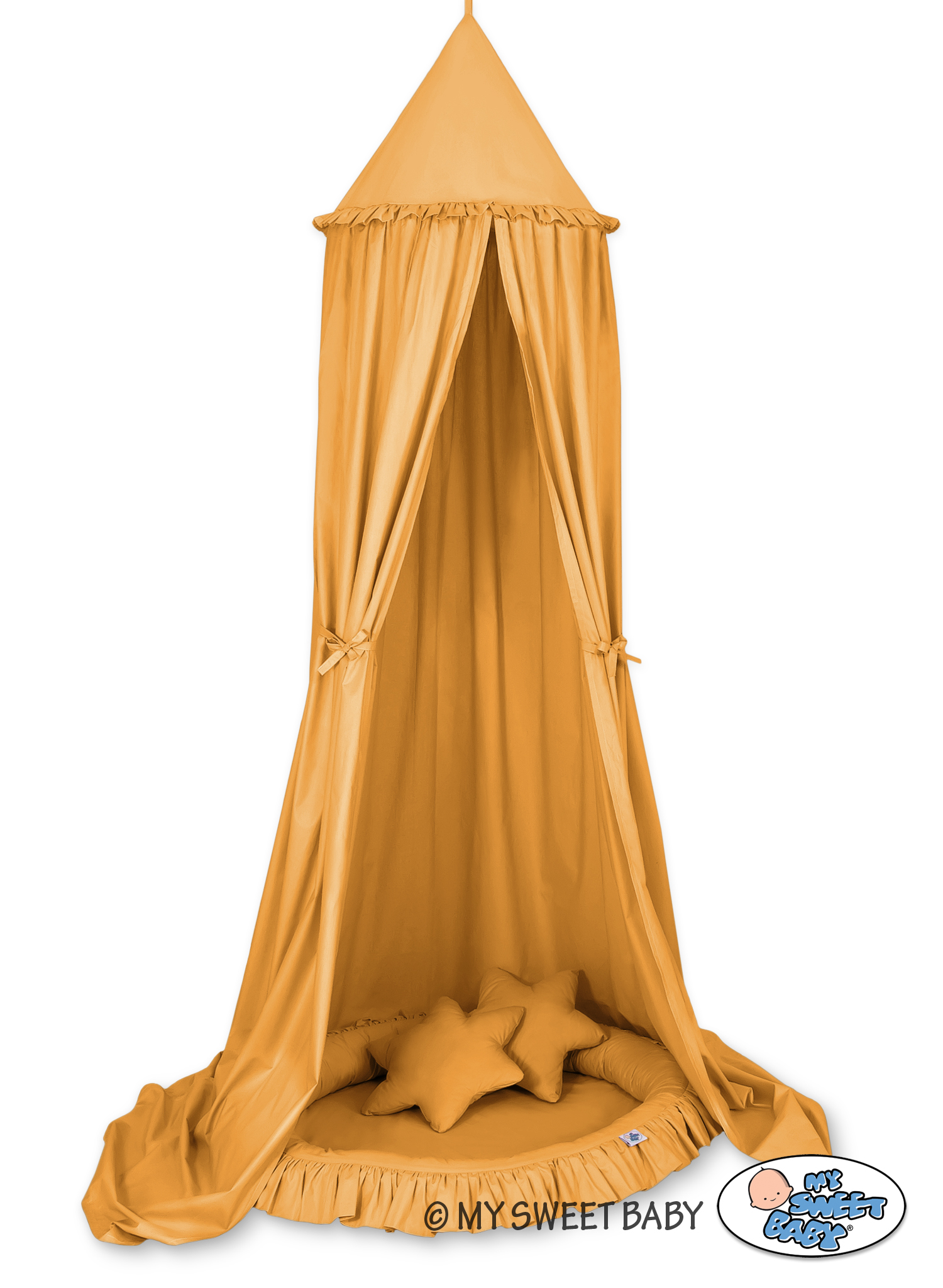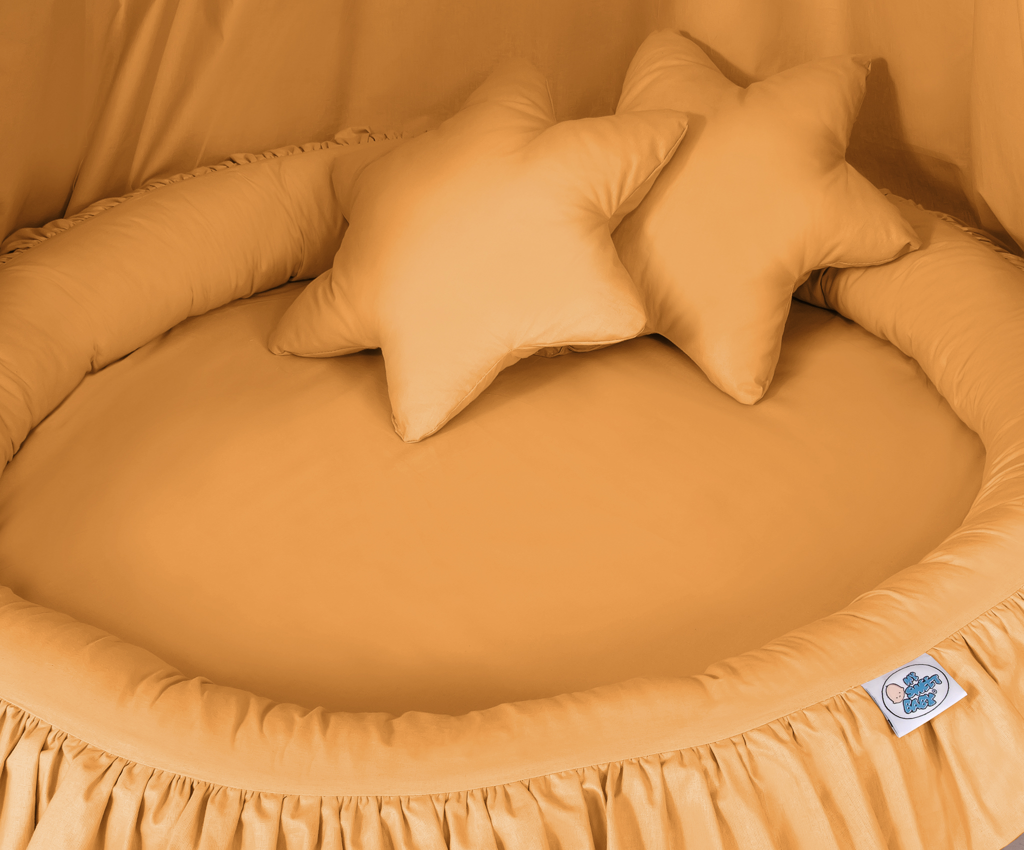 An effective long hanging canopy. A beautiful element it the children's room. It can be used as a unique decoration of a baby cot, as well as it can create a wonderful place to play. Hanging over the cot protect the canopy against too much light and noise creating a cozy and safe place to rest inside the cot. The canopy can be easily mounted to the ceiling. The length of 260 cm allows to arrange the ends on the floor. This creates a perfect hiding place and playground for older children. The canopy is made of Okotex certificated, 100% cotton fabric. On the sides there are practical ribbons for tying the canopy and create a beautiful tent. The rim on the top can be removed. The fabric is washable by 30 Degrees. Combined with lovely nest with a flounce it will become a perfect place for fun. The soft edges provide safety for the babies. The edge is filled with approved, non-allergenic filling: Eco -Fillball fibers. They are soft, resilience and they assure the proper air circulation. The bottom of the baby nest with flounce is made of a modern, anti-allergenic, attested material. The bottom inlay can be removed and the cover can be washed at 30 degrees.