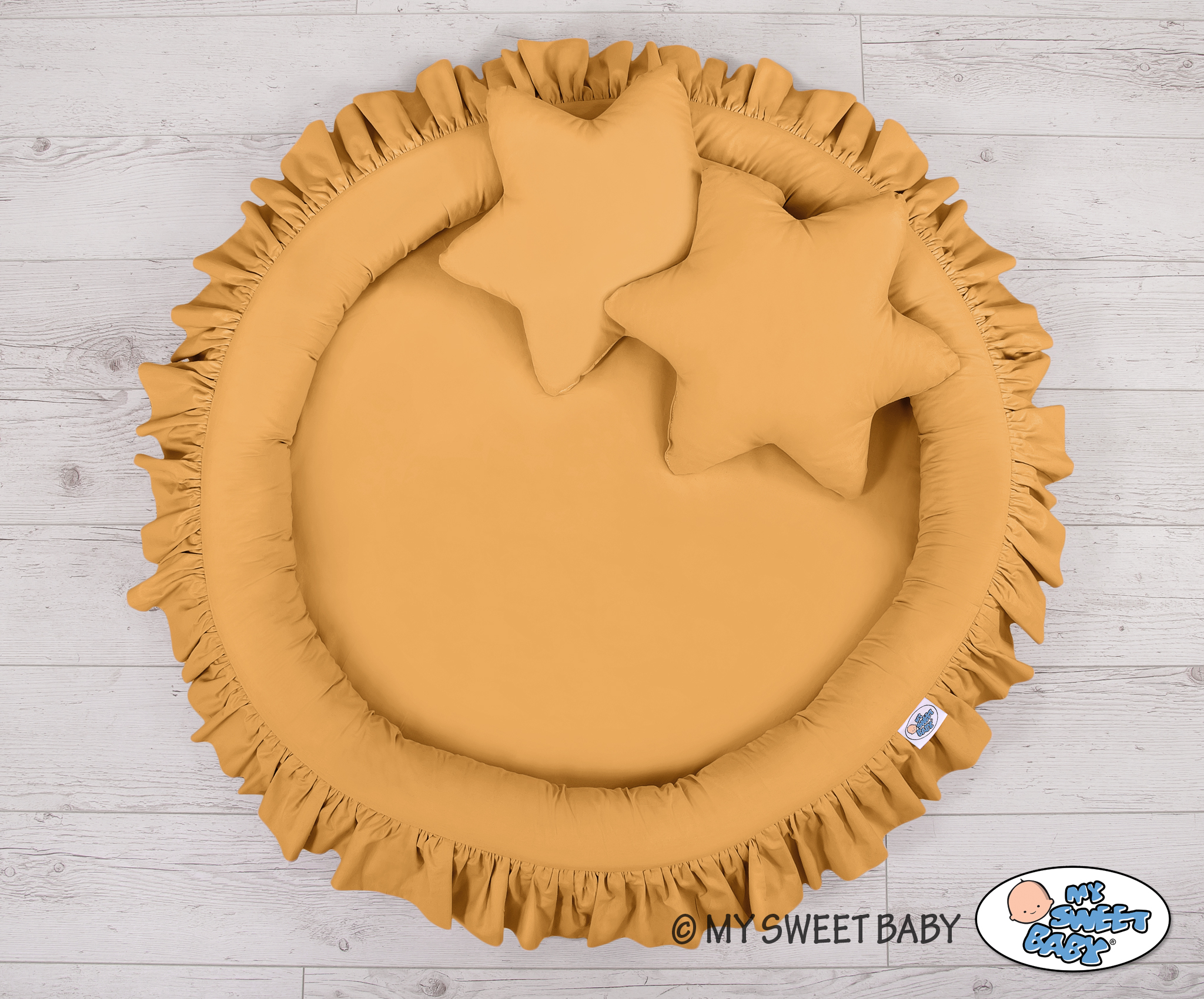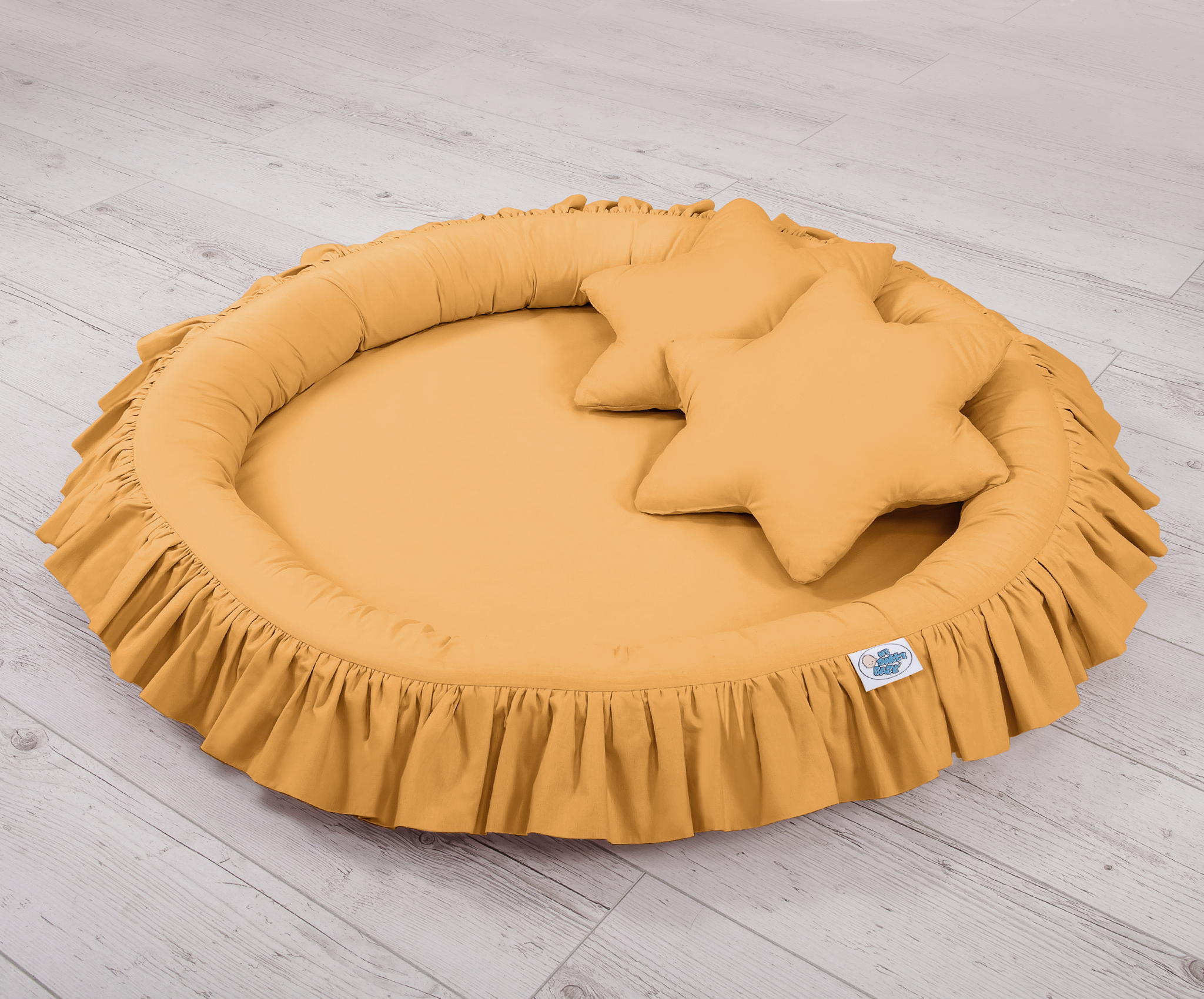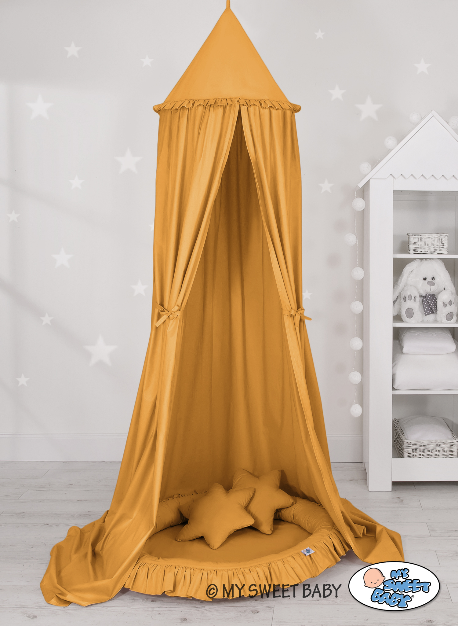 An effective long hanging canopy. A beautiful element it the children's room. It can be used as a unique decoration of a baby cot, as well as it can create a wonderful place to play. Hanging over the cot protect the canopy against too much light and noise creating a cozy and safe place to rest inside the cot. The canopy can be easily mounted to the ceiling. The length of 260 cm allows to arrange the ends on the floor. This creates a perfect hiding place and playground for older children. The canopy is made of Okotex certificated, 100% cotton fabric. On the sides there are practical ribbons for tying the canopy and create a beautiful tent. The rim on the top can be removed. The fabric is washable by 30 Degrees. Combined with lovely nest with a flounce it will become a perfect place for fun. The soft edges provide safety for the babies. The edge is filled with approved, non-allergenic filling: Eco -Fillball fibers. They are soft, resilience and they assure the proper air circulation. The bottom of the baby nest with flounce is made of a modern, anti-allergenic, attested material. The bottom inlay can be removed and the cover can be washed at 30 degrees.