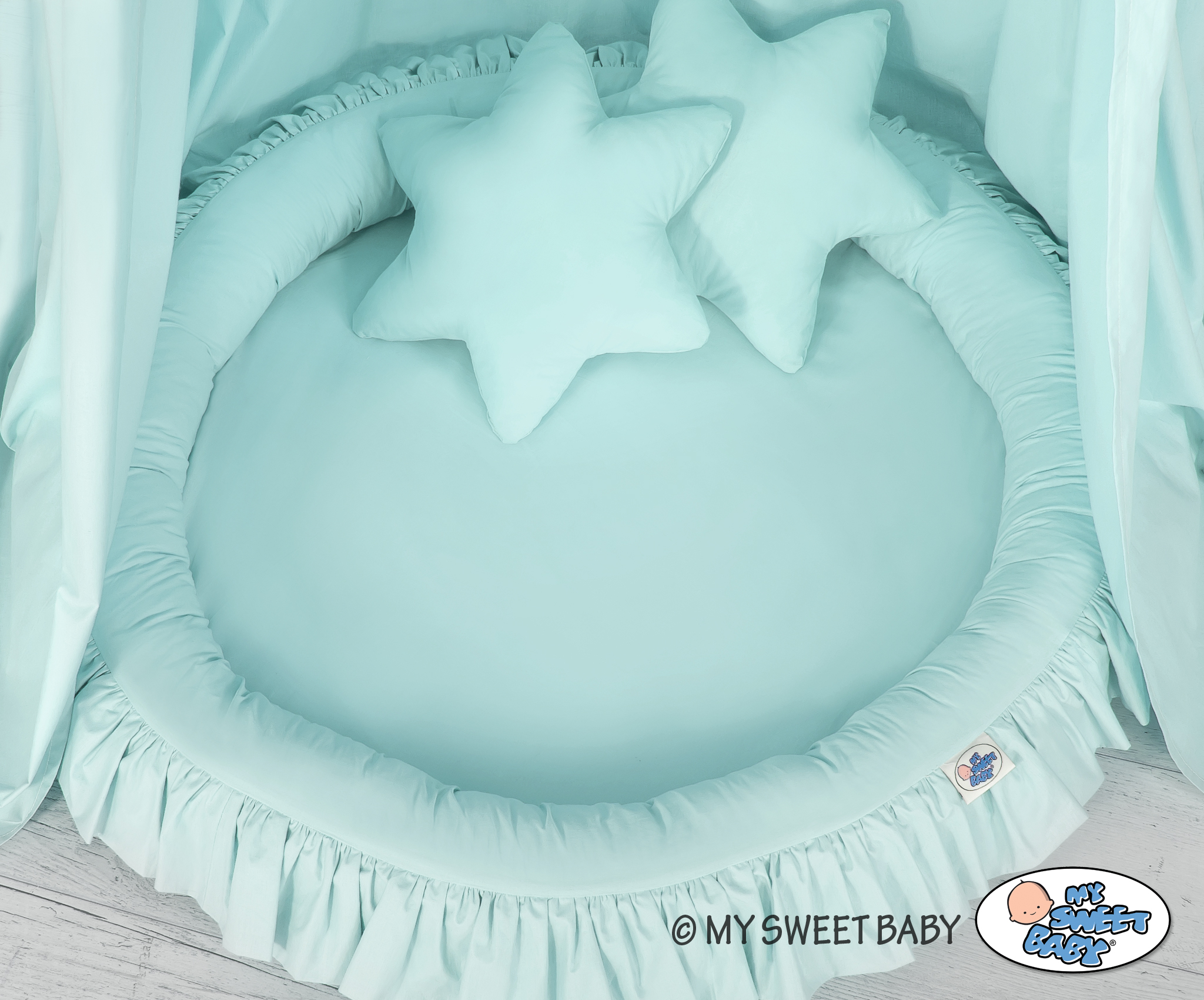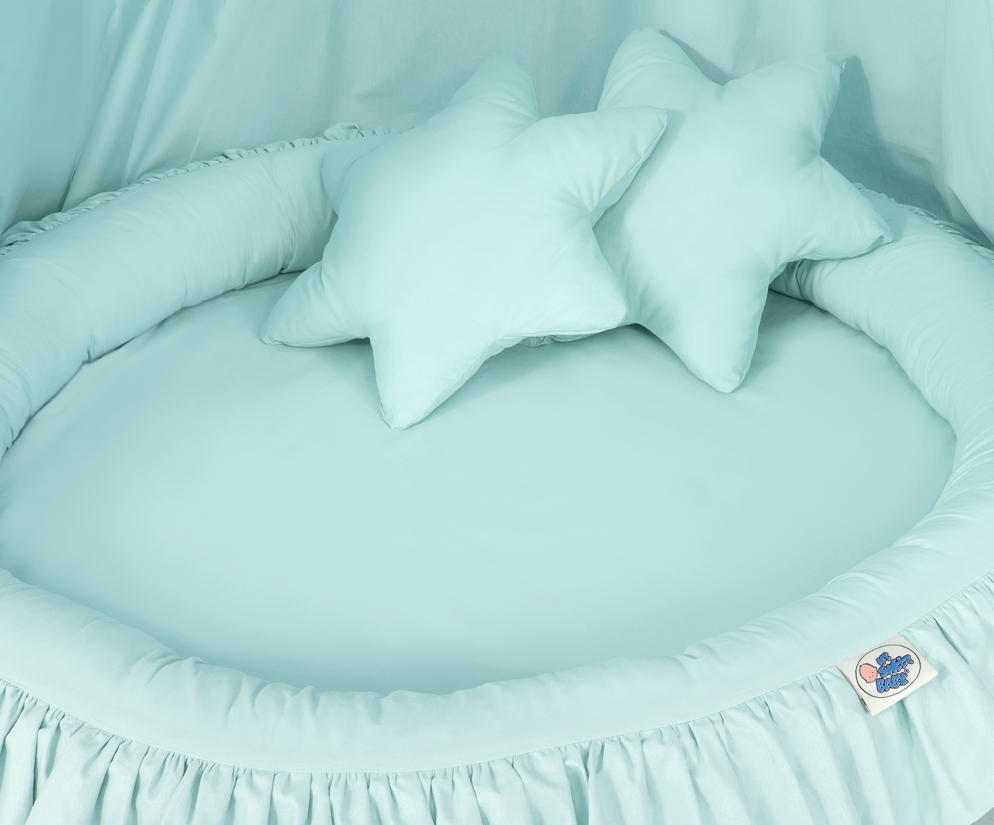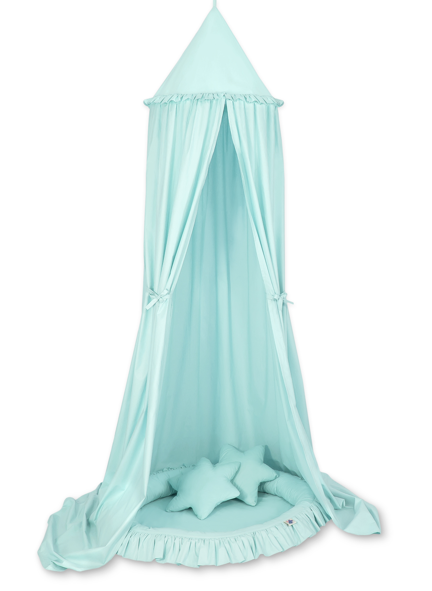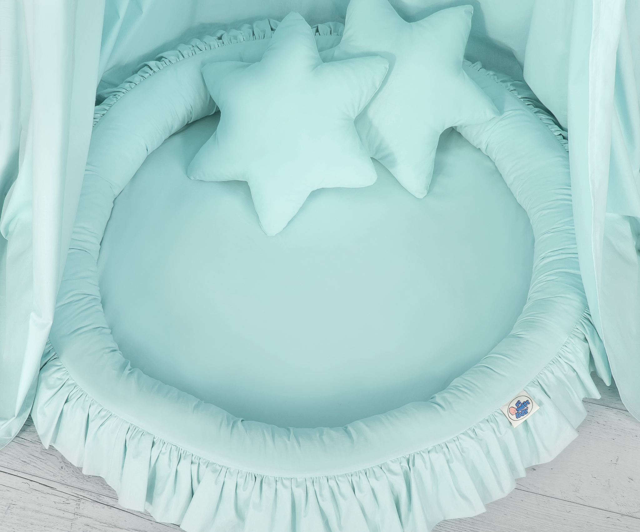 An effective long hanging canopy. A beautiful element it the children's room. It can be used as a unique decoration of a baby cot, as well as it can create a wonderful place to play. Hanging over the cot protect the canopy against too much light and noise creating a cozy and safe place to rest inside the cot. The canopy can be easily mounted to the ceiling. The length of 260 cm allows to arrange the ends on the floor. This creates a perfect hiding place and playground for older children. The canopy is made of Okotex certificated, 100% cotton fabric. On the sides there are practical ribbons for tying the canopy and create a beautiful tent. The rim on the top can be removed. The fabric is washable by 30 Degrees. Combined with lovely nest with a flounce it will become a perfect place for fun. The soft edges provide safety for the babies. The edge is filled with approved, non-allergenic filling: Eco -Fillball fibers. They are soft, resilience and they assure the proper air circulation. The bottom of the baby nest with flounce is made of a modern, anti-allergenic, attested material. The bottom inlay can be removed and the cover can be washed at 30 degrees.