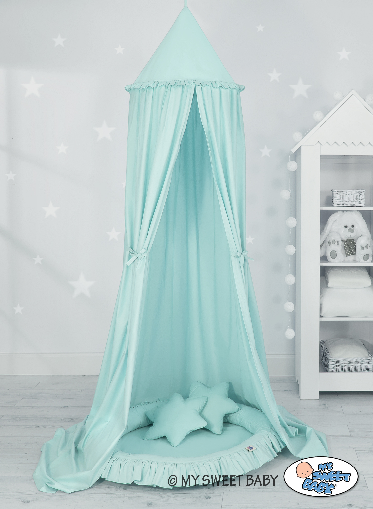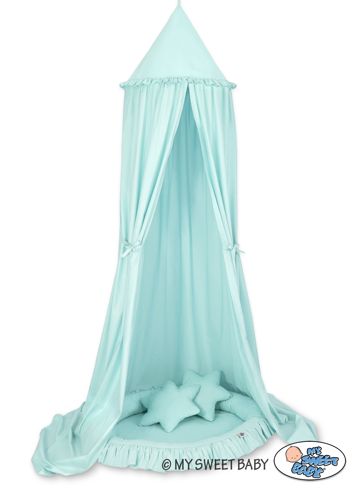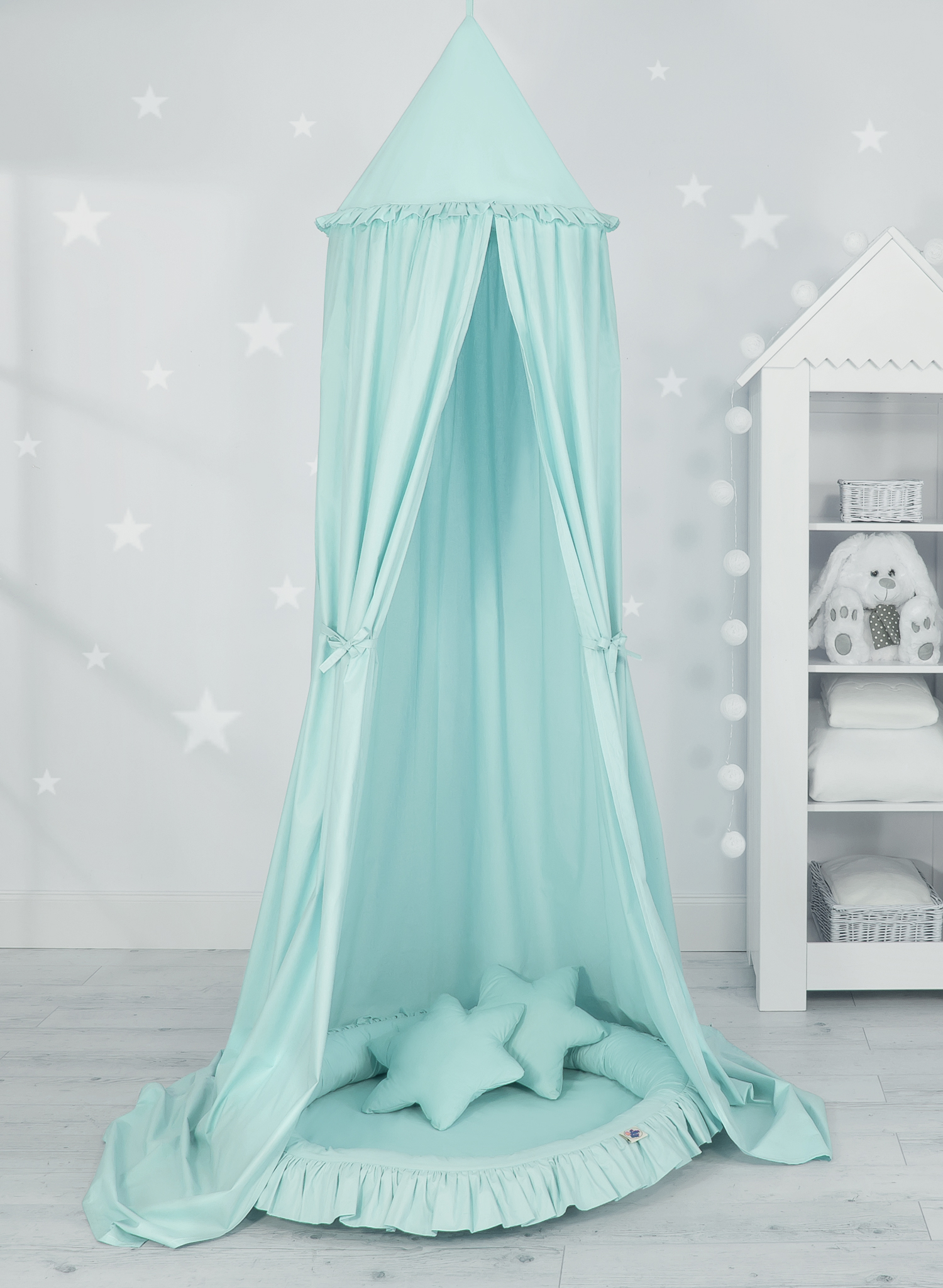 An effective long hanging canopy. A beautiful element it the children's room. It can be used as a unique decoration of a baby cot, as well as it can create a wonderful place to play. Hanging over the cot protect the canopy against too much light and noise creating a cozy and safe place to rest inside the cot. The canopy can be easily mounted to the ceiling. The length of 260 cm allows to arrange the ends on the floor. This creates a perfect hiding place and playground for older children. The canopy is made of Okotex certificated, 100% cotton fabric. On the sides there are practical ribbons for tying the canopy and create a beautiful tent. The rim on the top can be removed. The fabric is washable by 30 Degrees. Combined with lovely nest with a flounce it will become a perfect place for fun. The soft edges provide safety for the babies. The edge is filled with approved, non-allergenic filling: Eco -Fillball fibers. They are soft, resilience and they assure the proper air circulation. The bottom of the baby nest with flounce is made of a modern, anti-allergenic, attested material. The bottom inlay can be removed and the cover can be washed at 30 degrees.